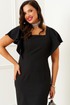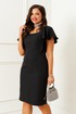 Платье прилегающего силуэта средней длины выполнено из костюмного смесового полотна.