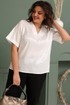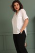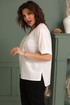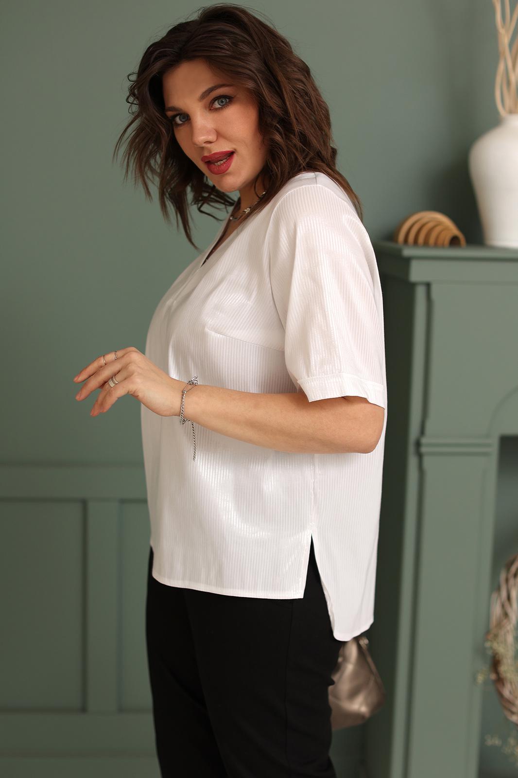 Горловина блузы имеет V - образный вырез, который прекрасно удлиняет линию шеи. Рукав укороченный и слегка расклешённый, низ которого обработан широкой подгибкой. Спинка длиннее переда и имеет форму полукруга, в боковых швах имеются разрезы по низу.