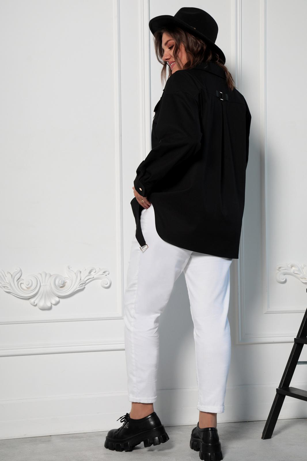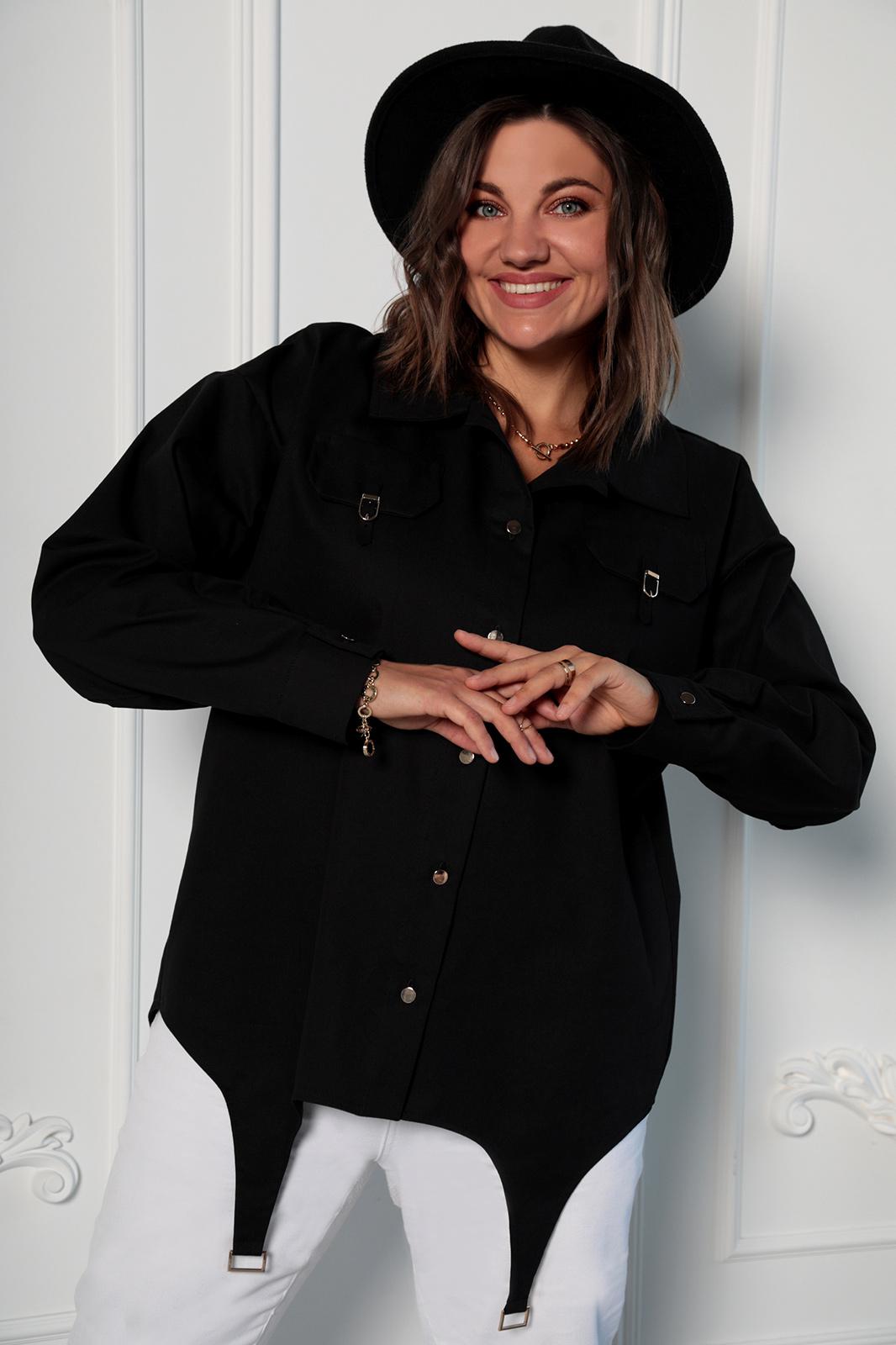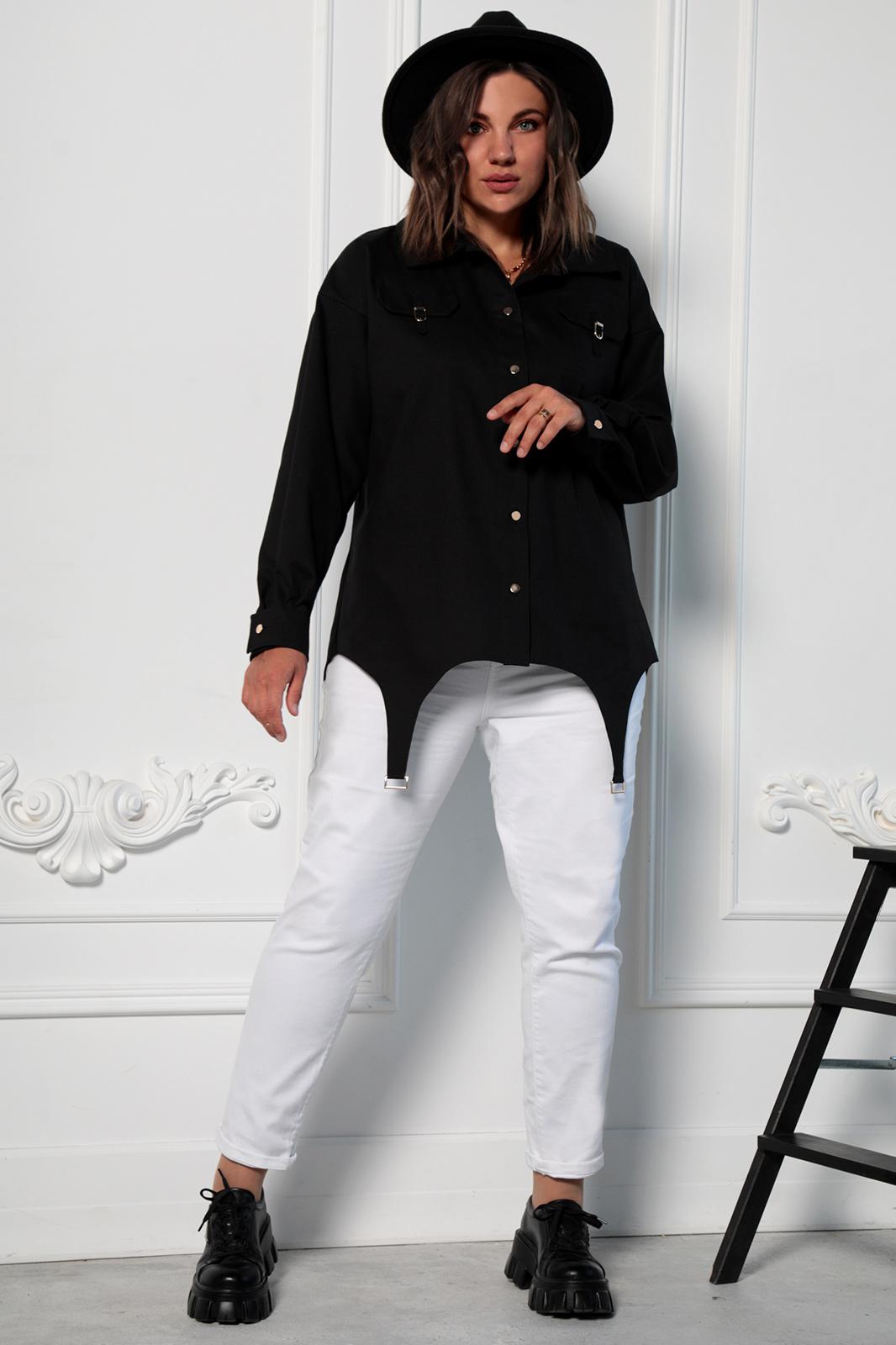 Оригинальный крой и яркие акценты - это то, что отличит Вас от окружающих. Необычная форма кроя подчеркнет вашу оригинальность и удлинит силуэт. Рубашка выполнена из хлопкового джинса. Перед имеет застёжку на петли-пуговицы, золотистого цвета. Воротник втачной, рубашечного типа. Спинка удлинённая, что создает эффект оверсайз. Слегка спущена линия плеча, а низ рукава обработан притачной манжетой. С помощью золотистой фурнитуры, расставлены яркие акценты на клапанах, кокетке спинки и фигурных деталях по низу переда.