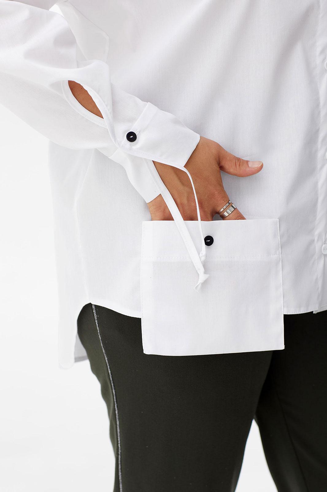 Спинка удлинённая, что создает эффект оверсайз. Линия плеча слегка спущена, а низ рукава обработан притачной акцентной манжетой с фигурным разрезом в виде капли, которая окантована свисающей бейкой из основной ткани.