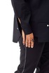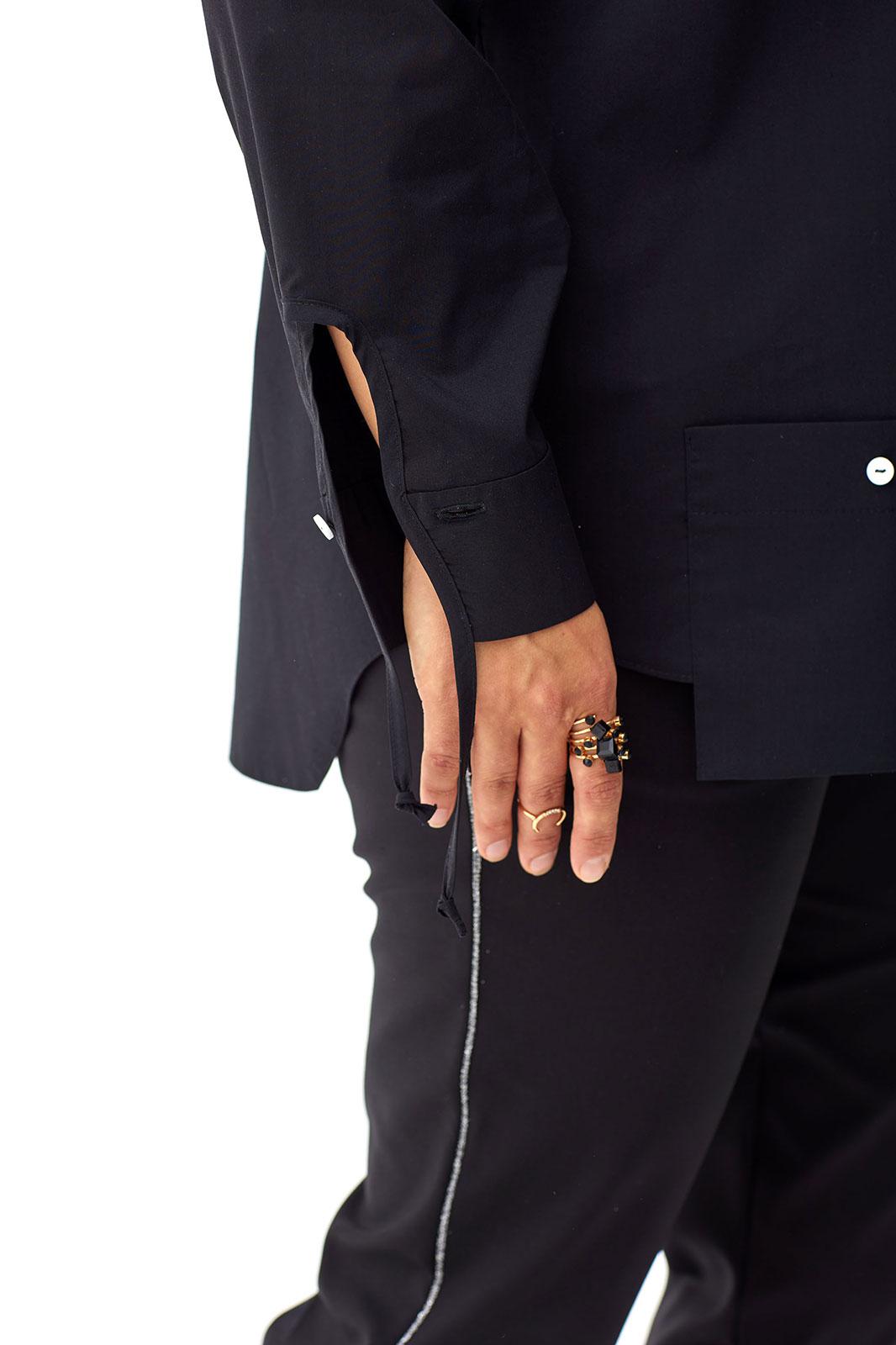 Спинка удлинённая, что создает эффект оверсайз. Линия плеча слегка спущена, а низ рукава обработан притачной акцентной манжетой с фигурным разрезом в виде капли, которая окантована свисающей бейкой из основной ткани.