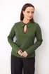 Горловина обработана воротником и имеет вырез в виде капли с застёжкой на пуговицу, который визуально удлиняет шею и рисует красивое декольте. Передняя часть с нагрудными вытачками. Рукав втачной, полной длины, низ которого обработан вподгибку.