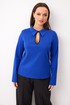 Горловина обработана воротником и имеет вырез в виде капли с застёжкой на пуговицу, который визуально удлиняет шею и рисует красивое декольте. Передняя часть с нагрудными вытачками. Рукав втачной, полной длины, низ которого обработан вподгибку.