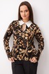 Горловина обработана воротником и имеет вырез в виде капли с застёжкой на пуговицу, который визуально удлиняет шею и рисует красивое декольте. Передняя часть с нагрудными вытачками. Рукав втачной, полной длины, низ которого обработан вподгибку.
