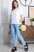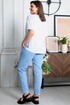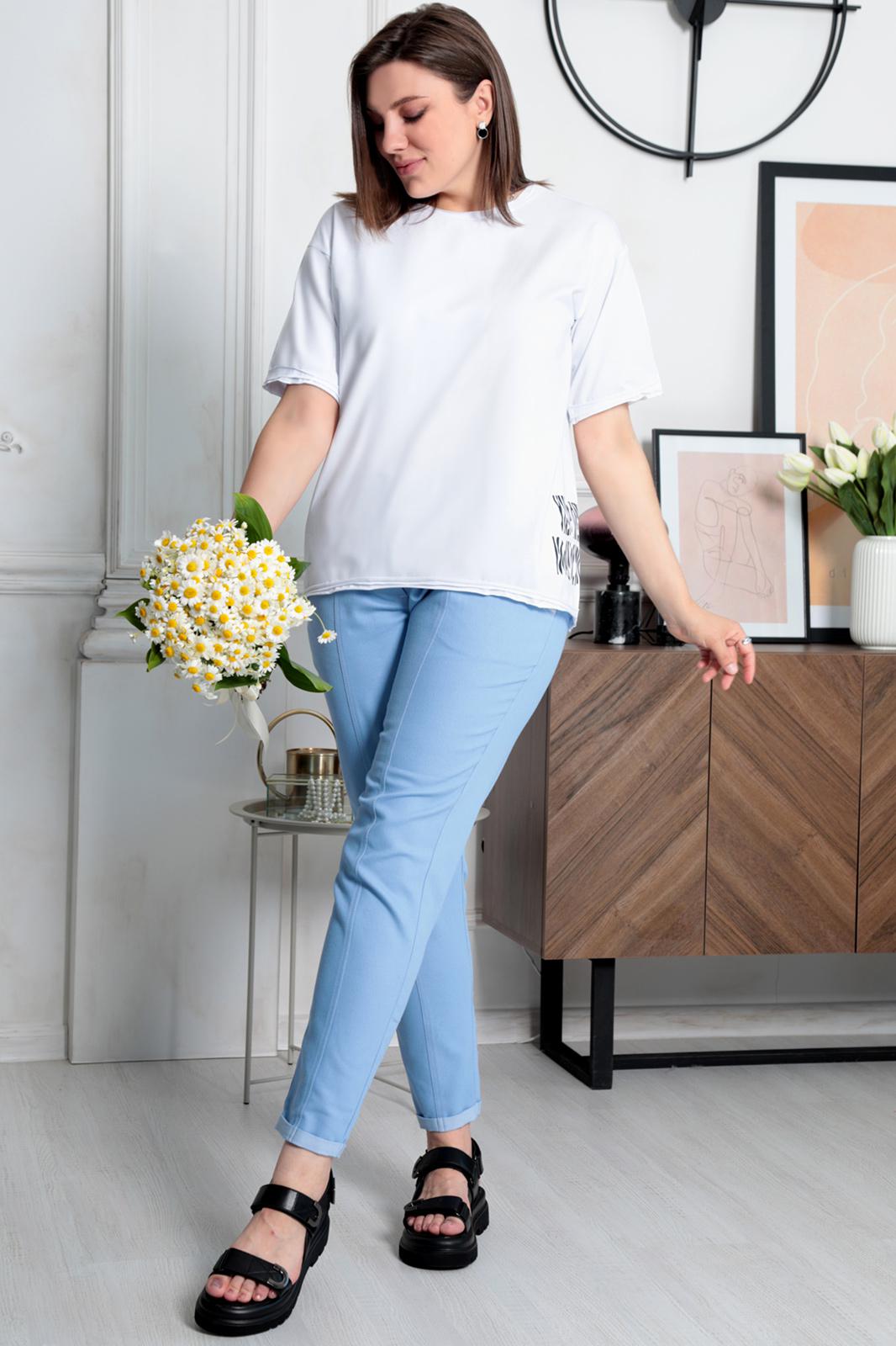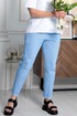 Брюки полуприлегающего силуэта. Выполнены из джинсовой, текстильной ткани со стрейчем. Прекрасно сочетаются с многочисленными образами. Имеют множество применений в комбинации с другими вещами и обувью. Пояс притачной, частично на эластичной резинке. Передняя часть разрезная, с декоративной отделкой гарусной нитью, которая создаёт эффект стрелки и зрительно удлиняет ножки. В боковых швах имеются карманы с отрезным бочком, декорированные бахромой. Низ с подворотом на лицевую сторону. Брючки имеют хорошую посадку за счёт отрезной кокетки по задней части.