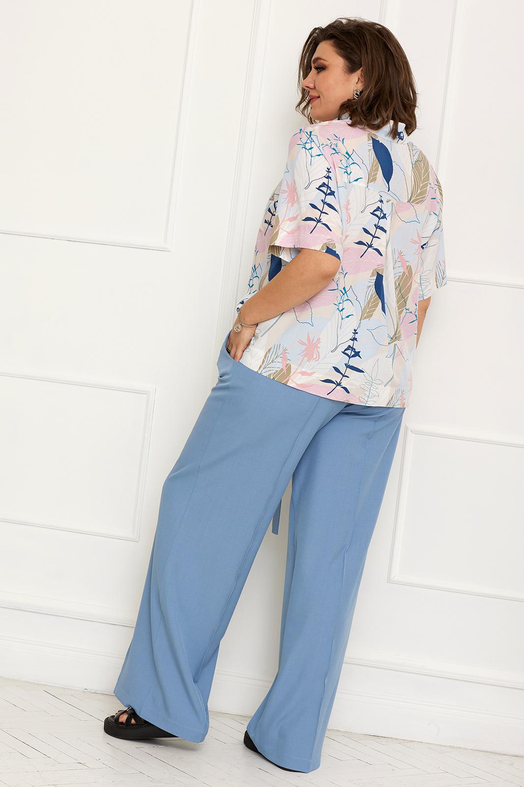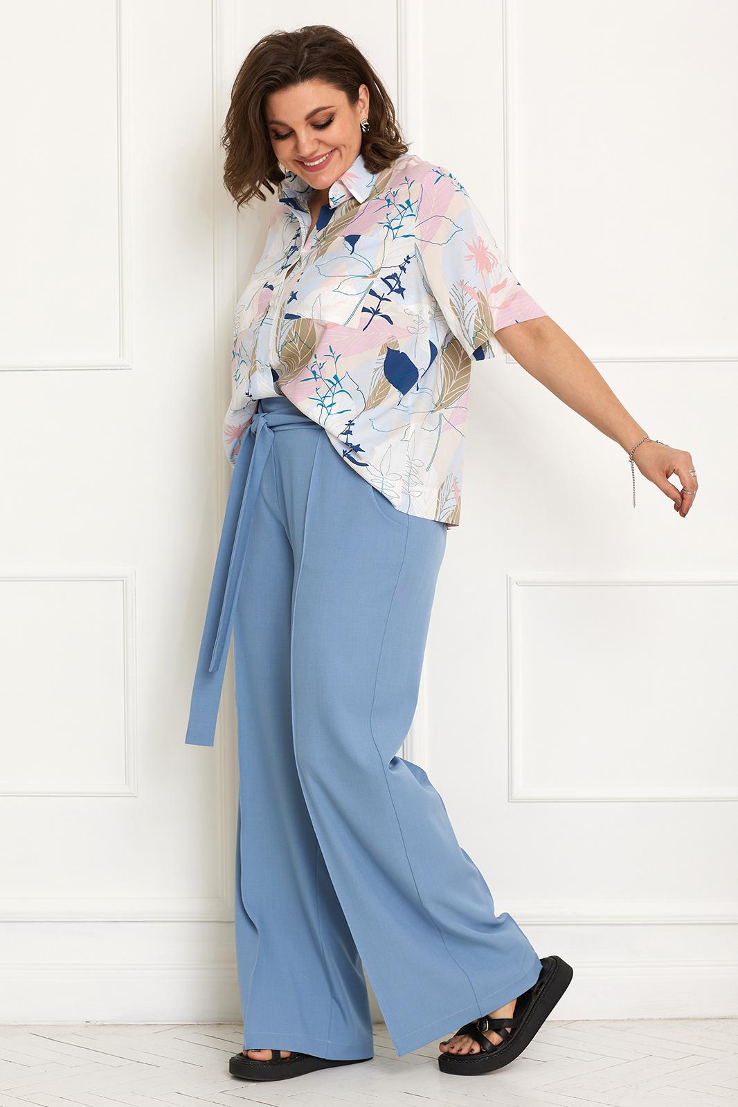 Пояс притачной, частично с эластичной резинкой, дополнен декоративным удлинённым ремнём. В боковых швах имеются карманы с отрезным бочком.