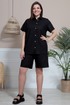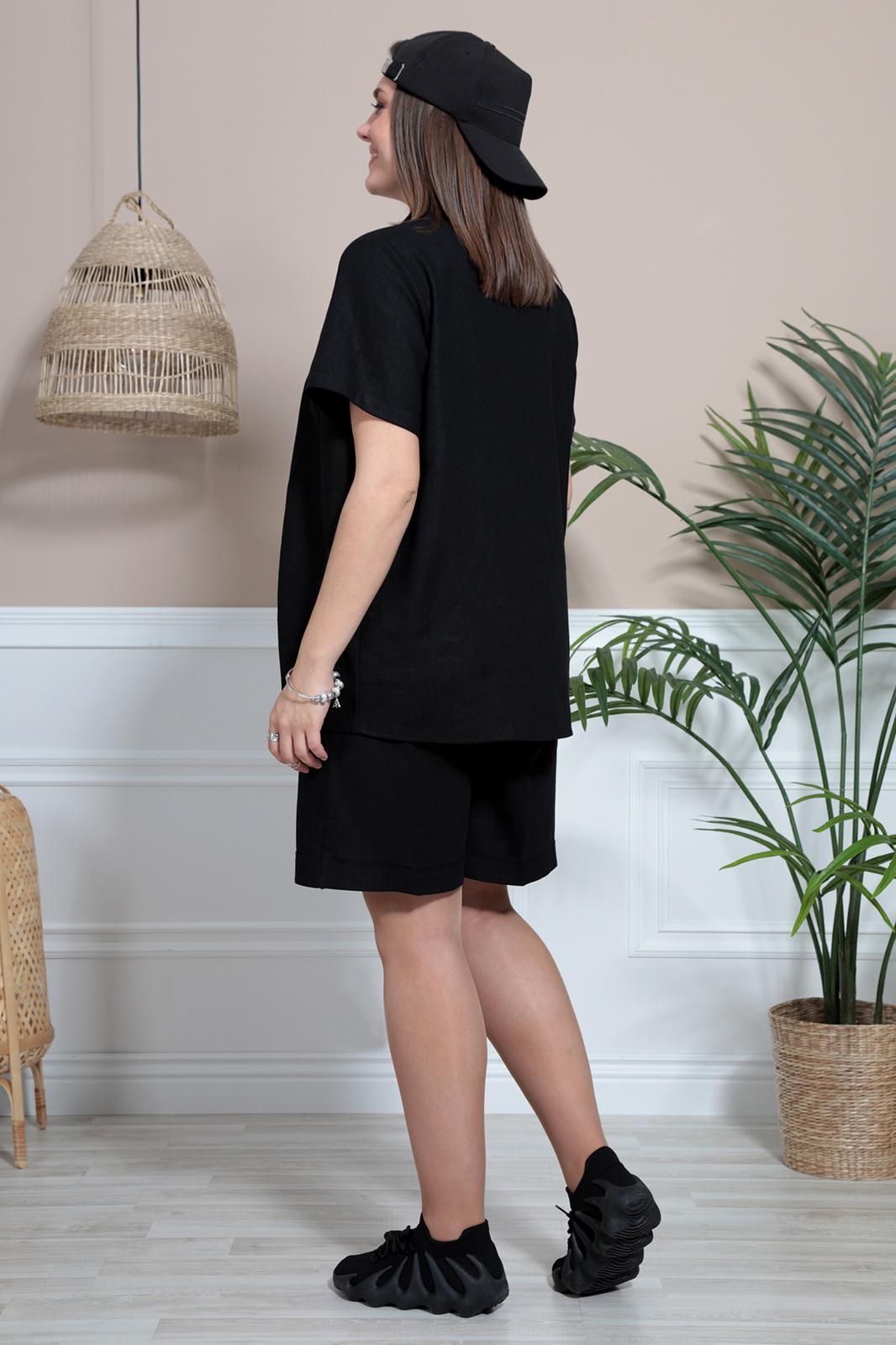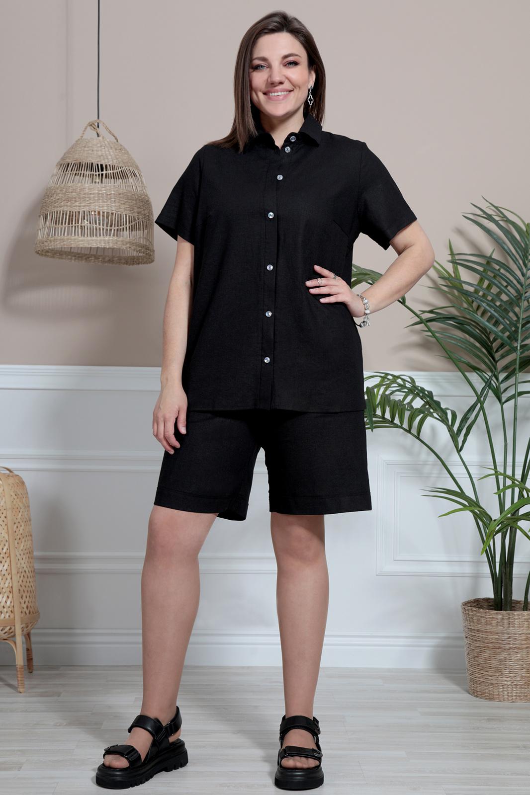 Комплект прямого силуэта, состоящий из рубашки и шорт. Идеальный летний комплект, который дарит чувство лёгкости и комфорта. Выполнен из текстильной льняной ткани. Горловина обработана отложным воротником на отрезной стойке. Перед блузы застёгивается с помощью петель-пуговиц, расположенных на притачной планке. Рукав втачной, укороченный. По низу с подворотом. Пуговицы с перламутровым переливом придают ещё больше яркости этой модели. Шорты свободного кроя. Пояс притачной, частично на эластичной резинке. В боковых швах карманы «Хулиганы». Низ с широким подворотом на лицевую сторону.