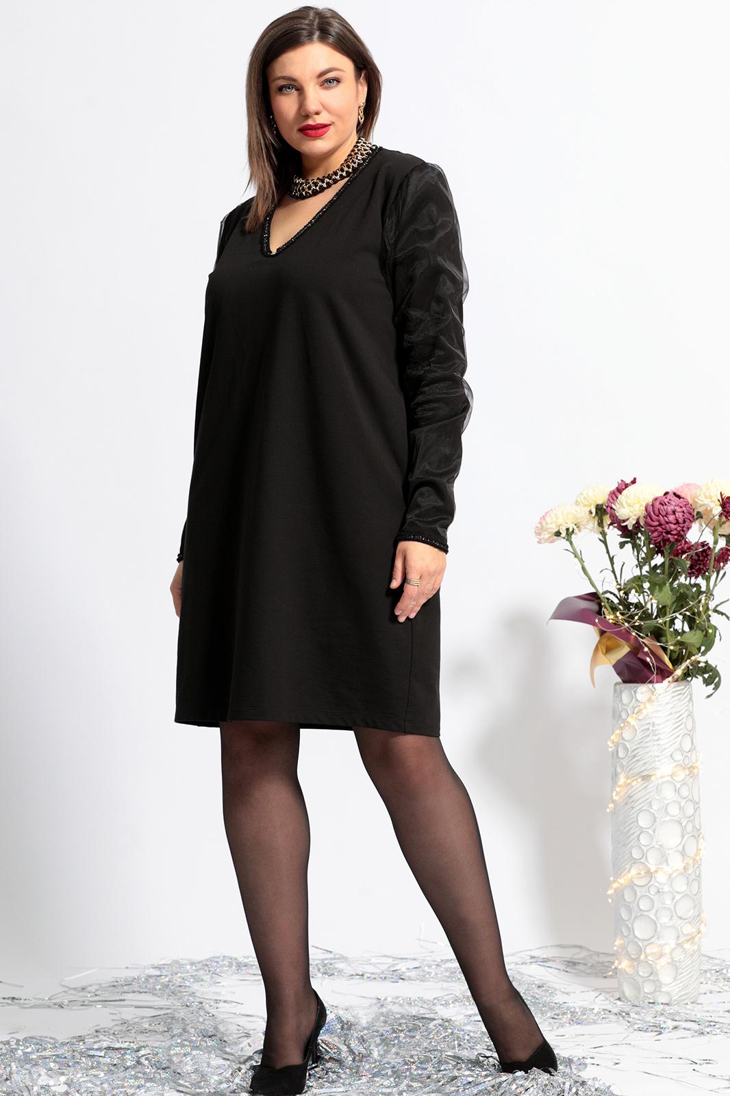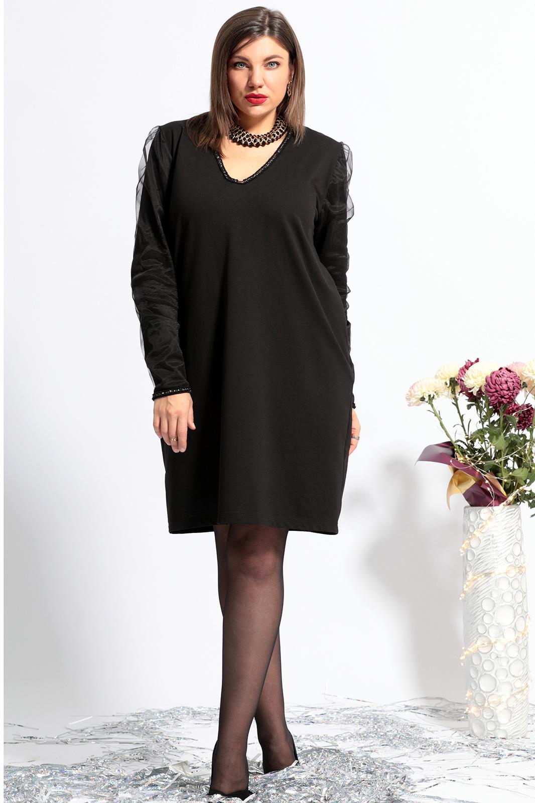 Платье женское полуприлегающего силуэта, без подкладки. Элегантное, маленькое чёрное платье, которое должно быть в гардеробе каждой модницы. Горловина имеет V-образный вырез, который декорирован чёрно-золотистой тесьмой и металлическим элементом золотистого цвета. В боковых швах имеются карманы. Визитной карточкой данного платья являются необычные рукава, выполненные из основной ткани и фатина, по низу так же настрочена чёрно-золотистая тесьма. Благодаря необычному исполнению платье выглядит особенно и интересно.