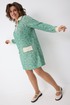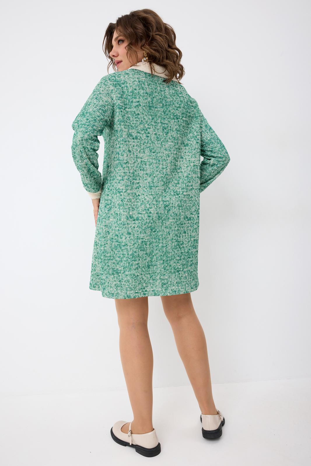 Рукав втачной, с манжетой. На передней части нагрудные вытачки. Акцентные, контрастного цвета воротник, манжеты и декоративные пришивные клапаны освежают образ. Планка и клапаны декорированы пуговицами. Низ платья обработан на плоскошовной машине.