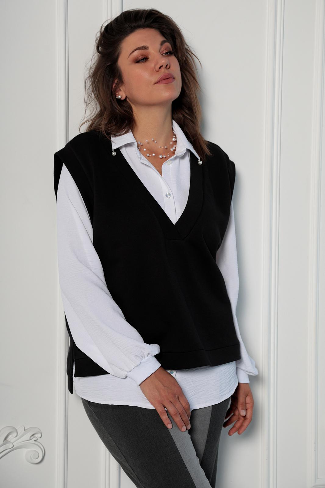 Трикотажный жилет без рукавов - это стильный элемент женской одежды, который позволяет создавать многослойные образы в любое время года. Выполнен из хлопкового трикотажа средней плотности. Задняя часть удлиненная, в боковых швах разрезики, которые не только дополняют интересный крой жилета, а так же созданы для вашего комфорта при носке и движении. V-образный вырез горловины обработан широкой обтачкой и визуально удлиняет шею и лицо. Жилет можно сочетать как с классической блузой, так и с футболкой. Пройма увеличенная, обработана притачной обтачкой, что позволяет сочетать жилет с любыми формами рукава, нижнего слоя образа.