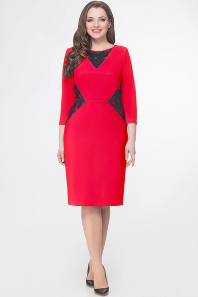 Платье женское прилегающего силуэта, длиной ниже линии коленей, с круглым вырезом горловины. Перед с вставкой оформленной углом, боковыми вставками и подрезом по линии талии. Вставки выполнены из отделочного материала. Рукава втачные, длиной 3/4. Платье со средним швом, по спинке с застежкой на тесьму-молнию и шлицей внизу. Отделкой платья служит украшение на рукаве. Длина платья 100 см.