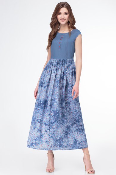 Платье женское прилегающего силуэта, отрезное по линии талии, с фигурными рельефами по лифу платья и круглым вырезом горловины с бейкой. Платье со сборкой по подрезу и притачной планкой с декоративными пуговицами, короткими рукавами, юбка свободная, расширенная к низу, с боковыми карманами с листочками. Платье длиной ниже линии икры, на подкладке. Низ рукавов и нижняя часть пройм в платье обработана окантовочной тесьмой.