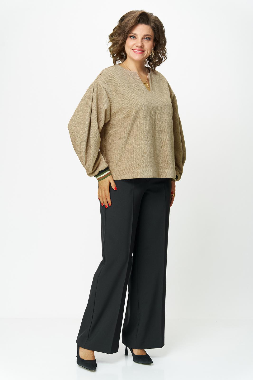 Блуза, свободного силуэта, из трикотажной ткани, вырез горловины V-образный,рукав немного спущенный, фигурный, спинка цельная. Длина по спинке 59 см.