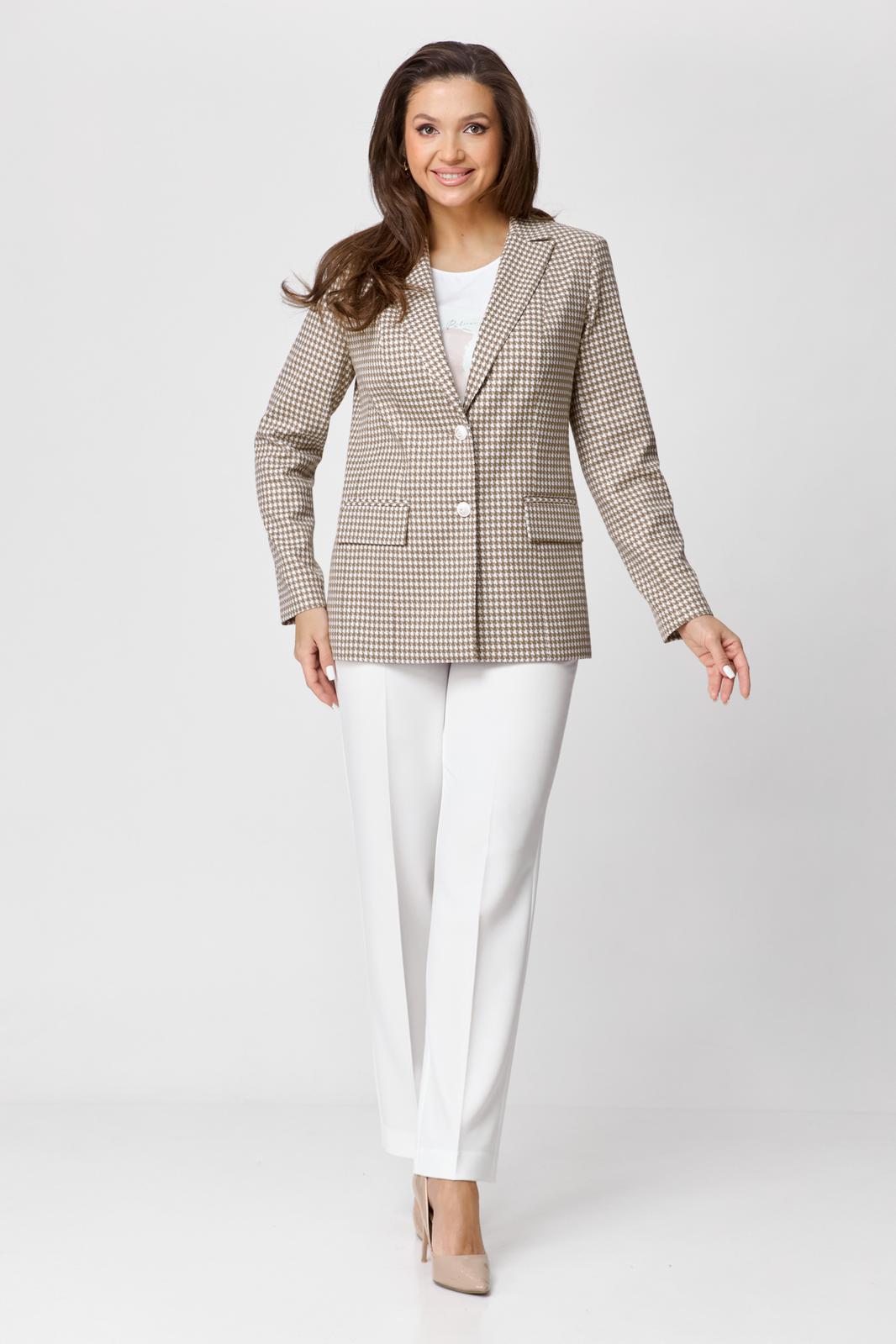 Комплект женский-двойка, из текстильной ткани, жакет удлиненный, полуприлегающего силуэта с центральной бортовой застежкой на пуговицы до линии перегиба лацкана. Спереди рельефные швы от плечевого шва, отрезной бочок и карман с клапаном. Спинка с рельефами от плечевого шва. Рукав втачной, двухшовный. Воротник пиджачного типа. Жакет на подкладке, длина по спинке 67 см, длина рукава 62 см. Брюки прямые, классические, с заутюженными стрелками, по переду обработаны карманы с отрезным бочком, застежка на тесьму-молнию и 1 пуговицу. На задних половинках обработаны вытачки и имитация карманов с листочкой, пояс в брюках притачной. Длина брюк от талии по боковому шву 103 см. Рекомендуем к комплекту блузу 479.