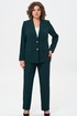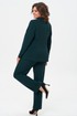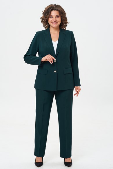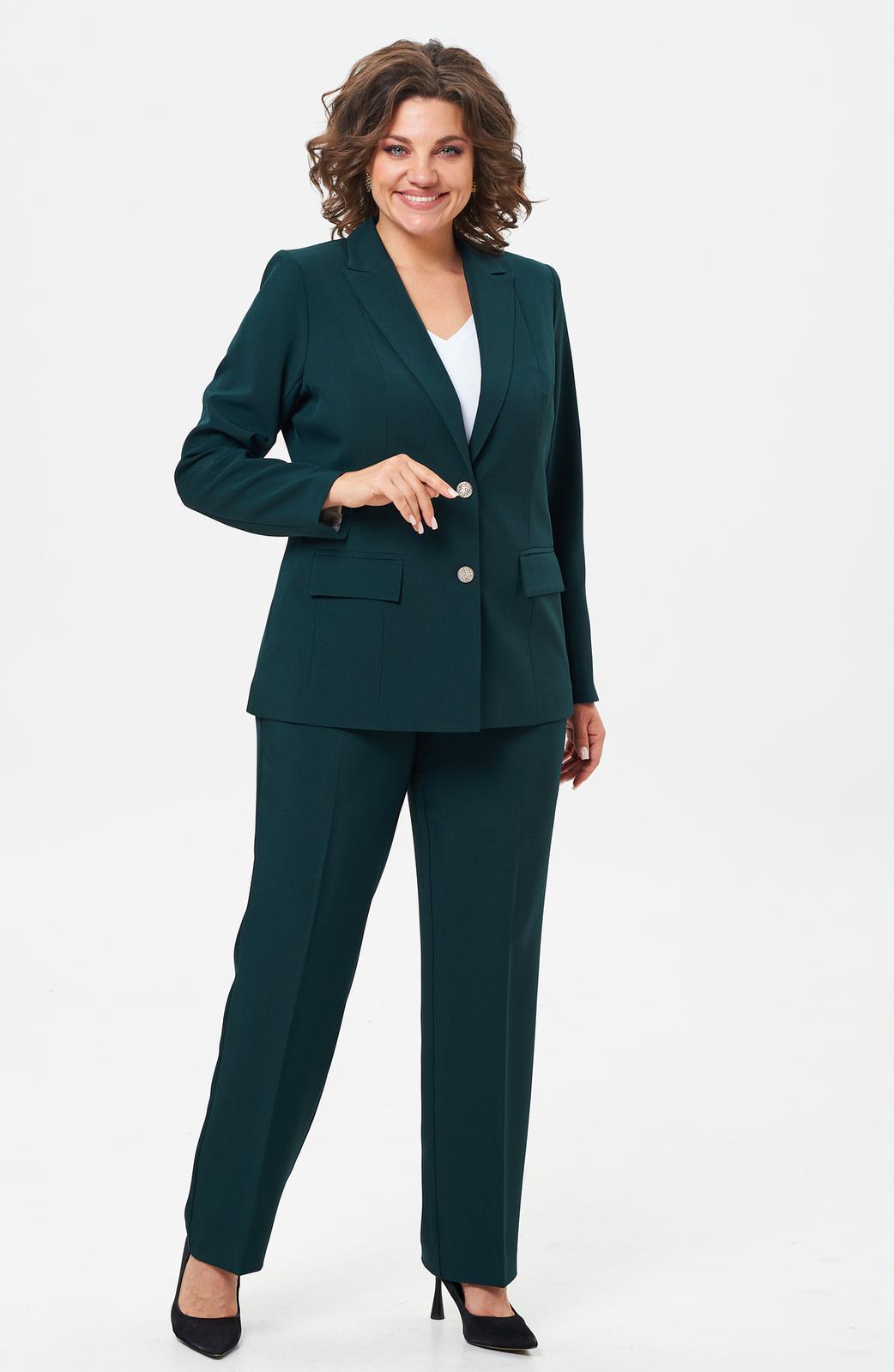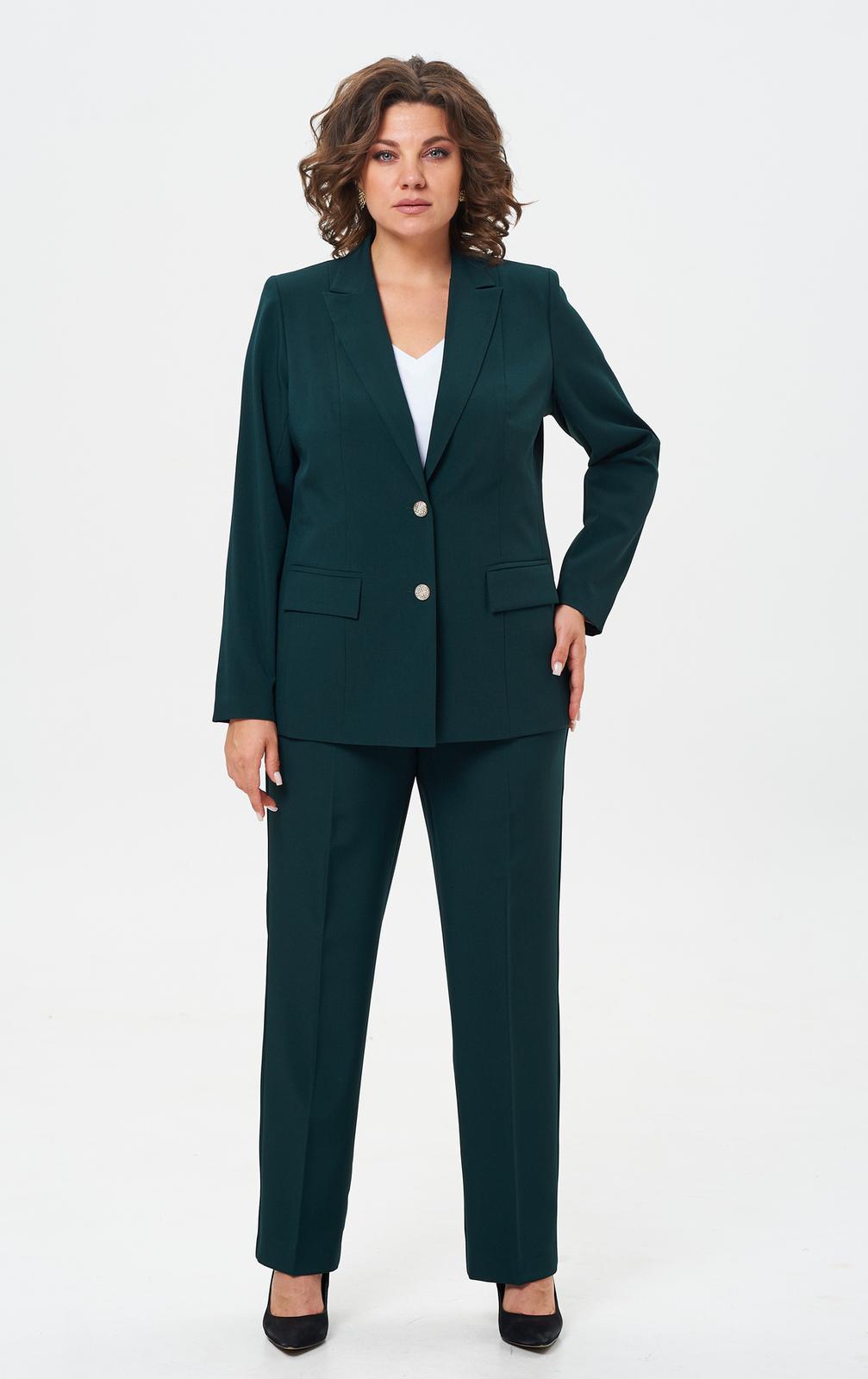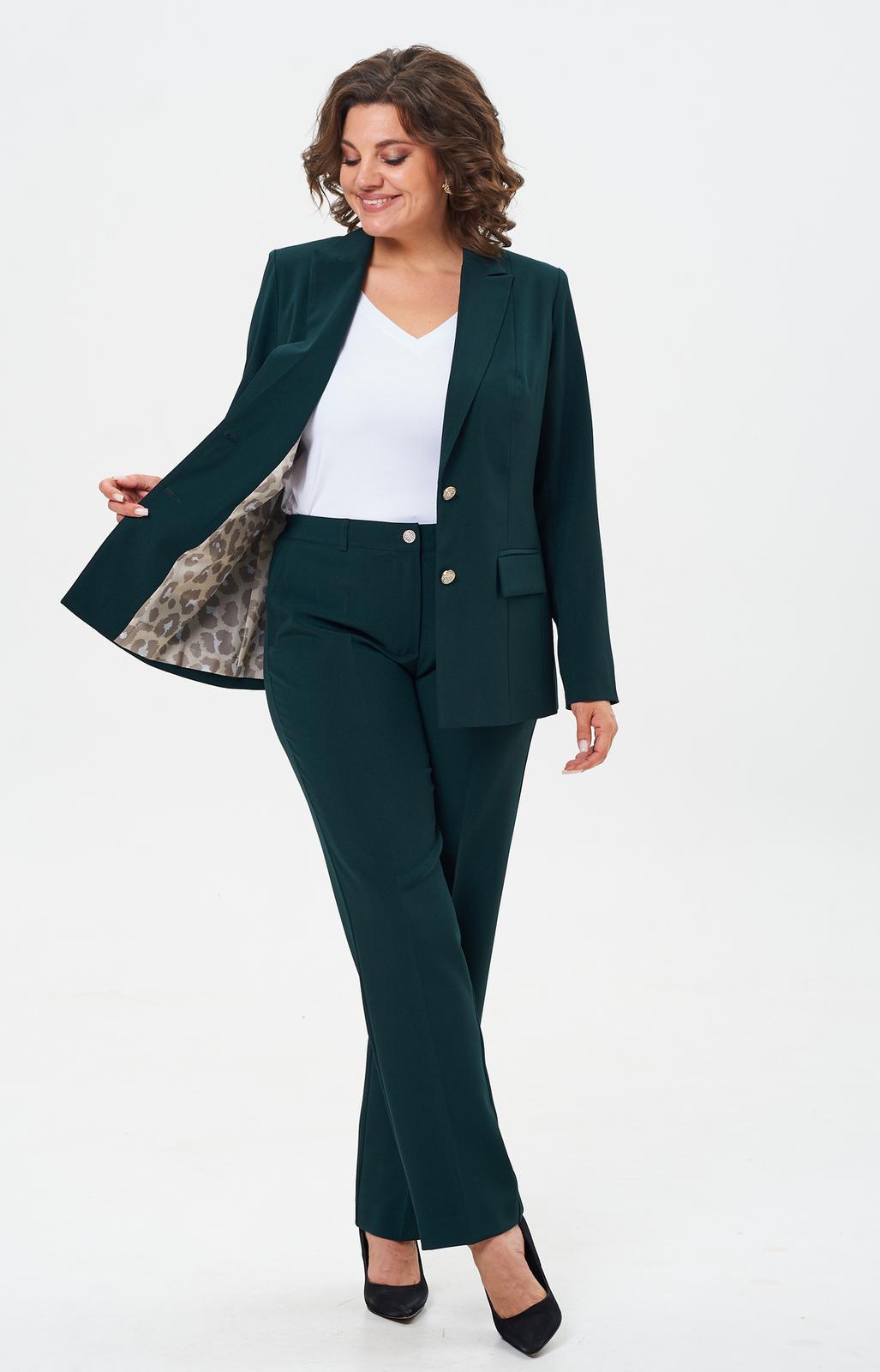 Комплект женский-двойка, из текстильной ткани, жакет удлиненный, полуприлегающего силуэта с центральной бортовой застежкой на пуговицы до линии перегиба лацкана. Спереди рельефные швы от плечевого шва, отрезной бочок и карман с клапаном. Спинка с рельефами от плечевого шва. Рукав втачной, двухшовный. Воротник пиджачного типа. Жакет на подкладке, длина по спинке 67 см, длина рукава 62 см. Брюки прямые, классические, с заутюженными стрелками, по переду обработаны карманы с отрезным бочком, застежка на тесьму-молнию и 1 пуговицу. На задних половинках обработаны вытачки и имитация карманов с листочкой, пояс в брюках притачной. Длина брюк от талии по боковому шву 103 см.