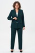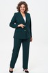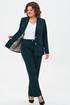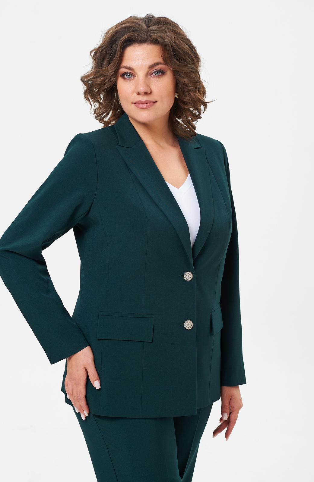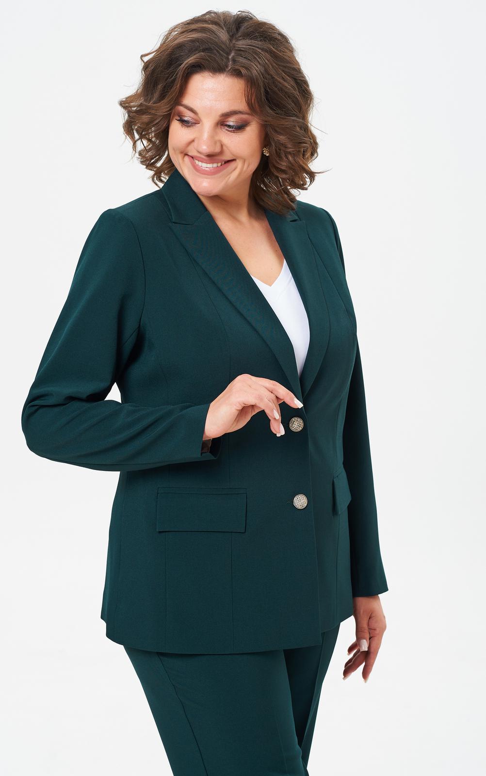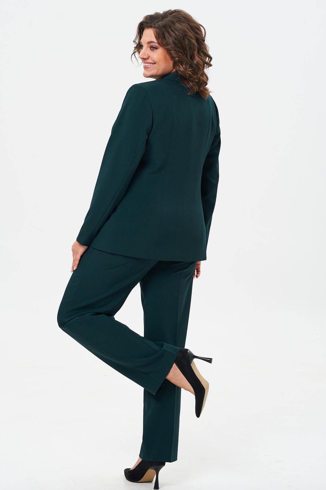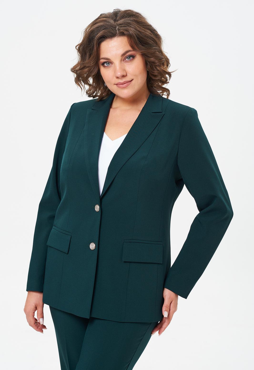 Комплект женский, 2-х предметный, состоит из жакета и и брюк. Жакет женский удлиненный, из текстильной ткани, на подкладке, полуприлегающего силуэта с центральной бортовой застежкой на пуговицы до линии перегиба лацкана. Спереди рельефные швы от плечевого шва, отрезной бочок и карман с клапаном. Спинка с рельефами от плечевого шва. Рукав втачной, двухшовный, по низу рукава обработана шлица на петли-пуговицы. Воротник пиджачного типа. Длина по спинке 66 см, длина рукава 62 см.Брюки прямые,классические, с заутюженными стрелками,по переду обработаны карманы с отрезным бочком,застежка на тесьму-молнию и 1 пуговицу.На задних половинках обработаны вытачки и имитация карманов с листочкой, пояс в брюках притачной. Длина брюк от талии по боковому шву 100 см.