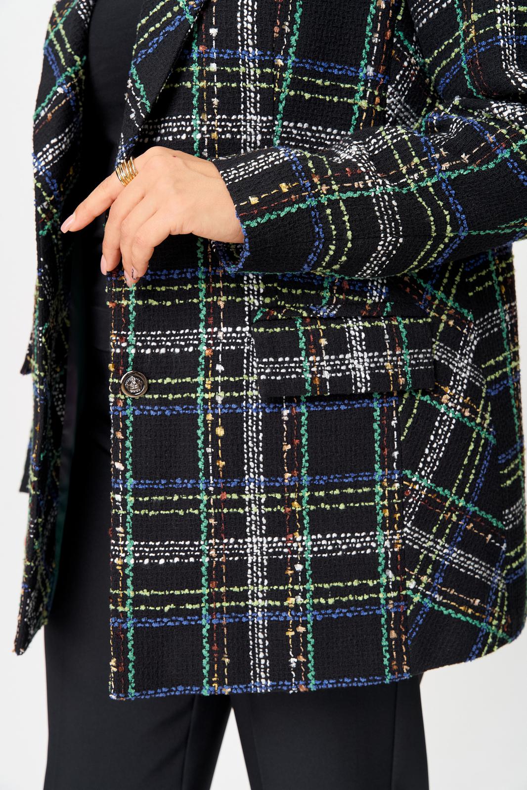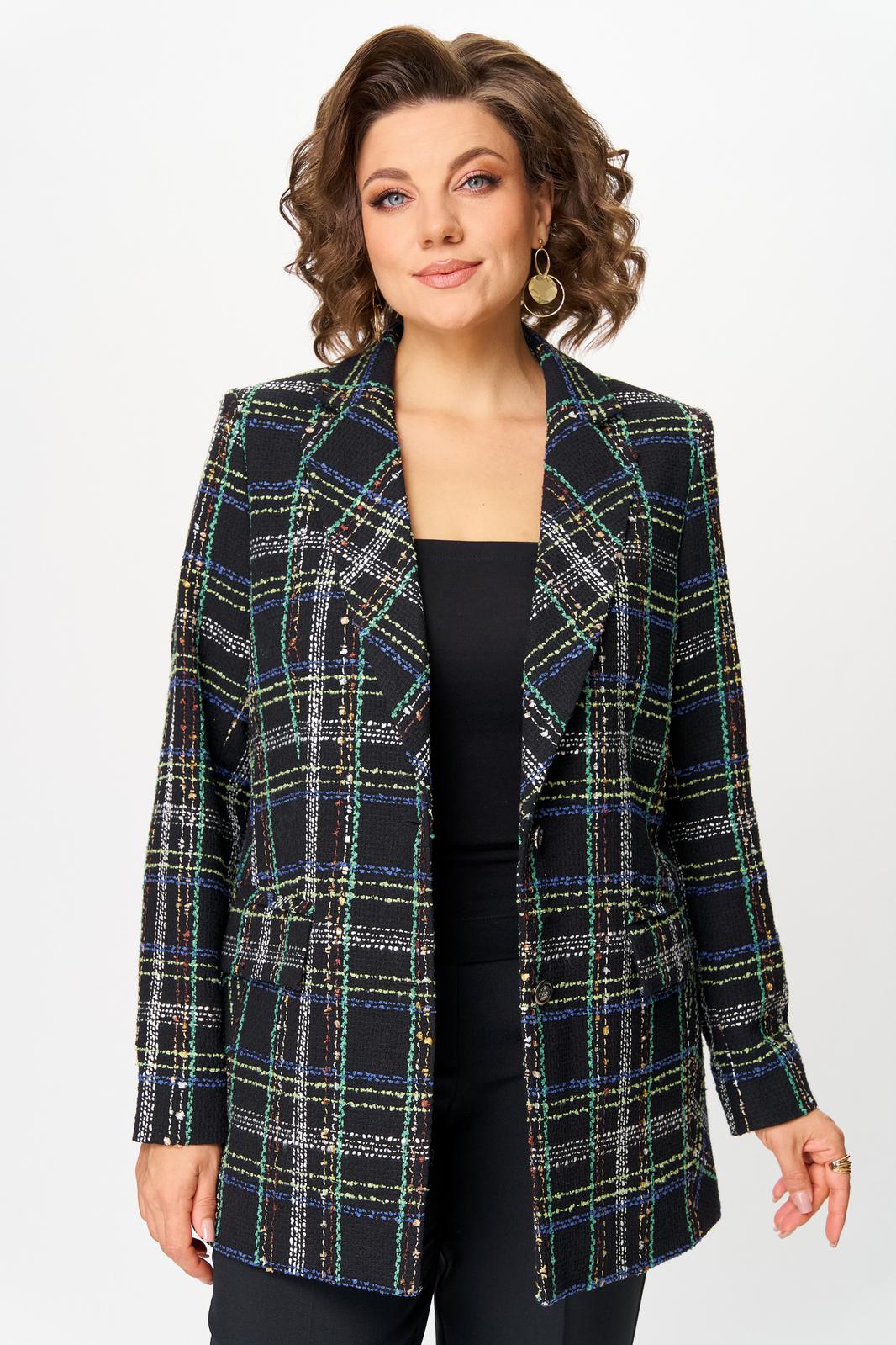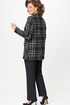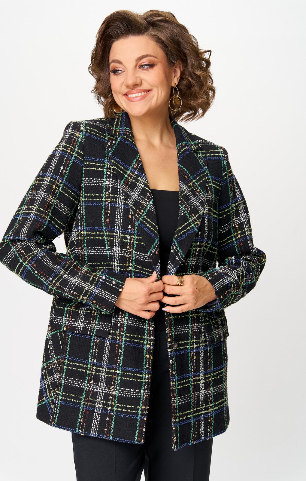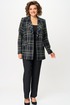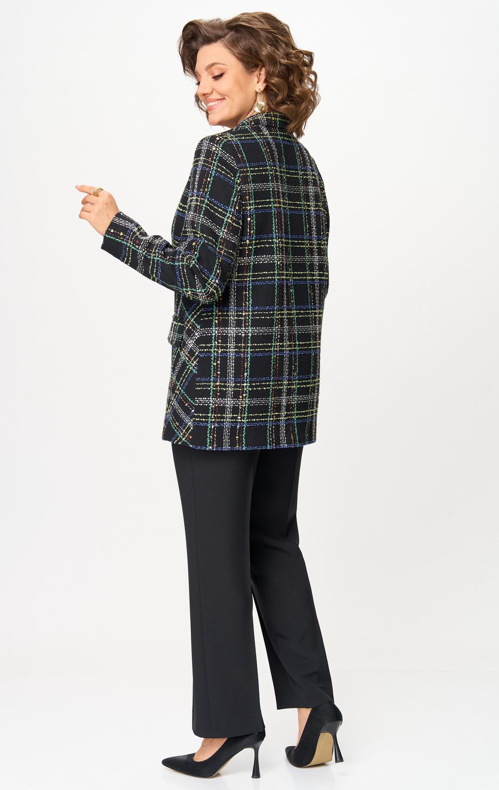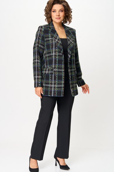 Комплект женский-двойка,из костюмной ткани, жакет удлиненный, свободного силуэта с центральной бортовой застежкой на пуговицы до линии перегиба лацкана. По переду имеется отрезной бочок и вертикальные вытачки. С прорезными карманами с клапаном и двумя обтачками. Спинка цельная. Воротник пиджачного типа. Рукав двухшовный, втачной. Жакет на подкладке. Длина рукава 63 см, длина по спинке 75 см. Брюки прямые, классические, из текстильной ткани, с заутюженными стрелками, по переду обработаны карманы с отрезным бочком, застежка на тесьму-молнию и 1 пуговицу. На задних половинках обработаны вытачки и имитация карманов с листочкой, пояс в брюках притачной. Длина брюк от талии по боковому шву 103 см.