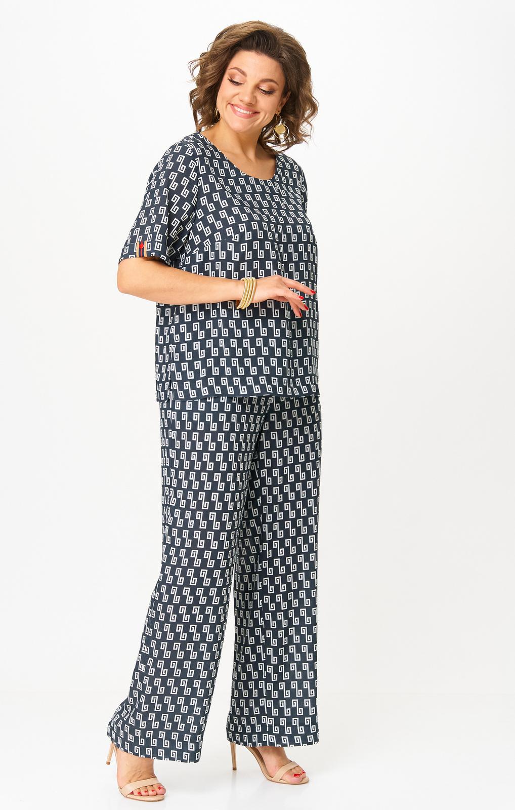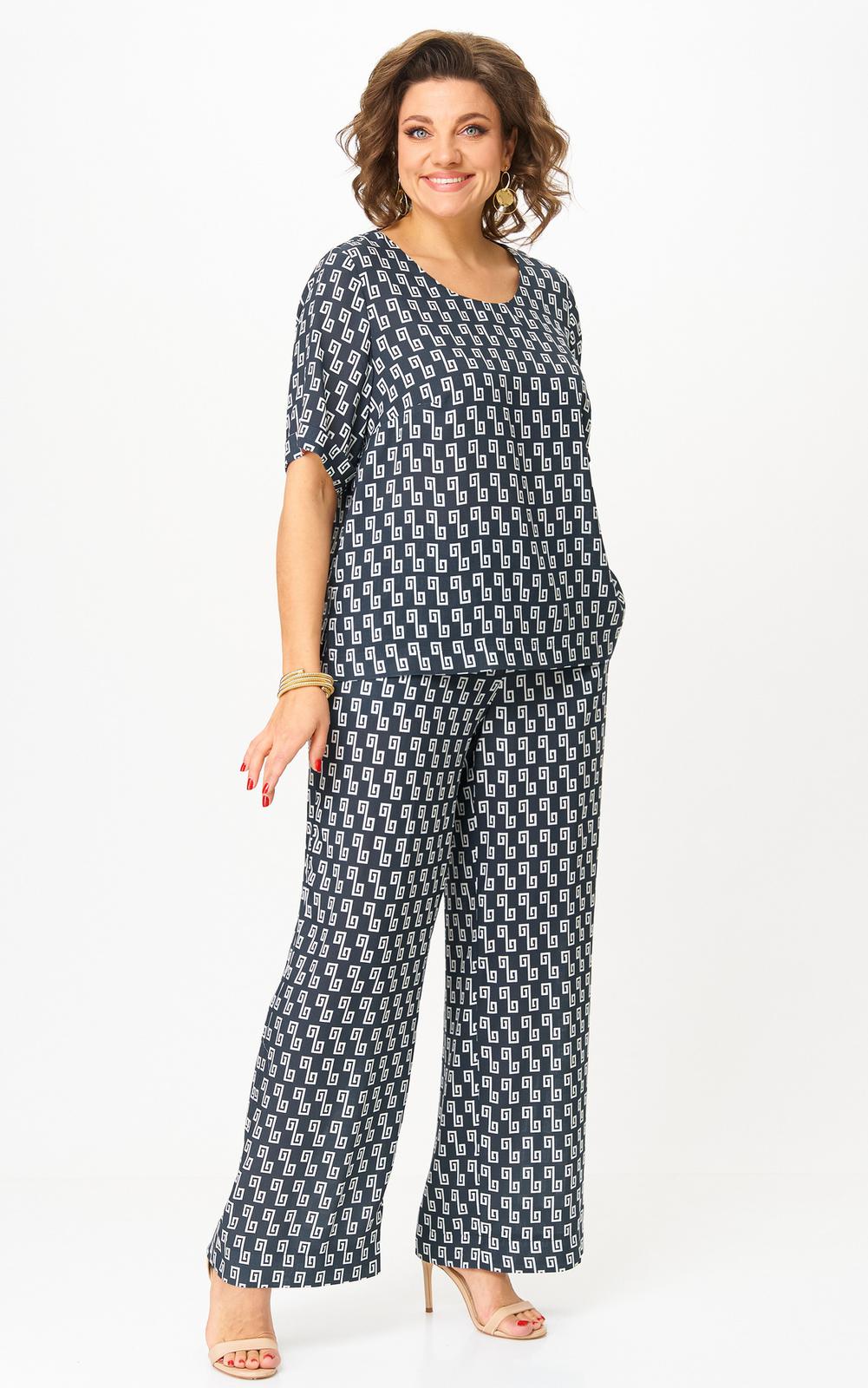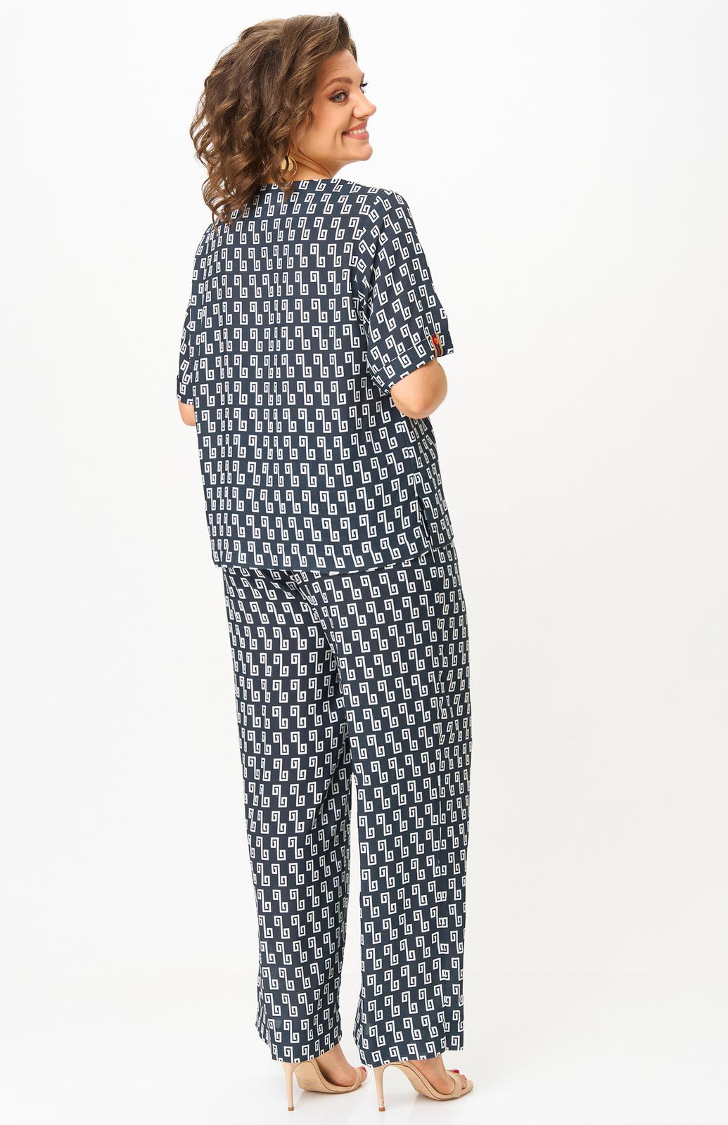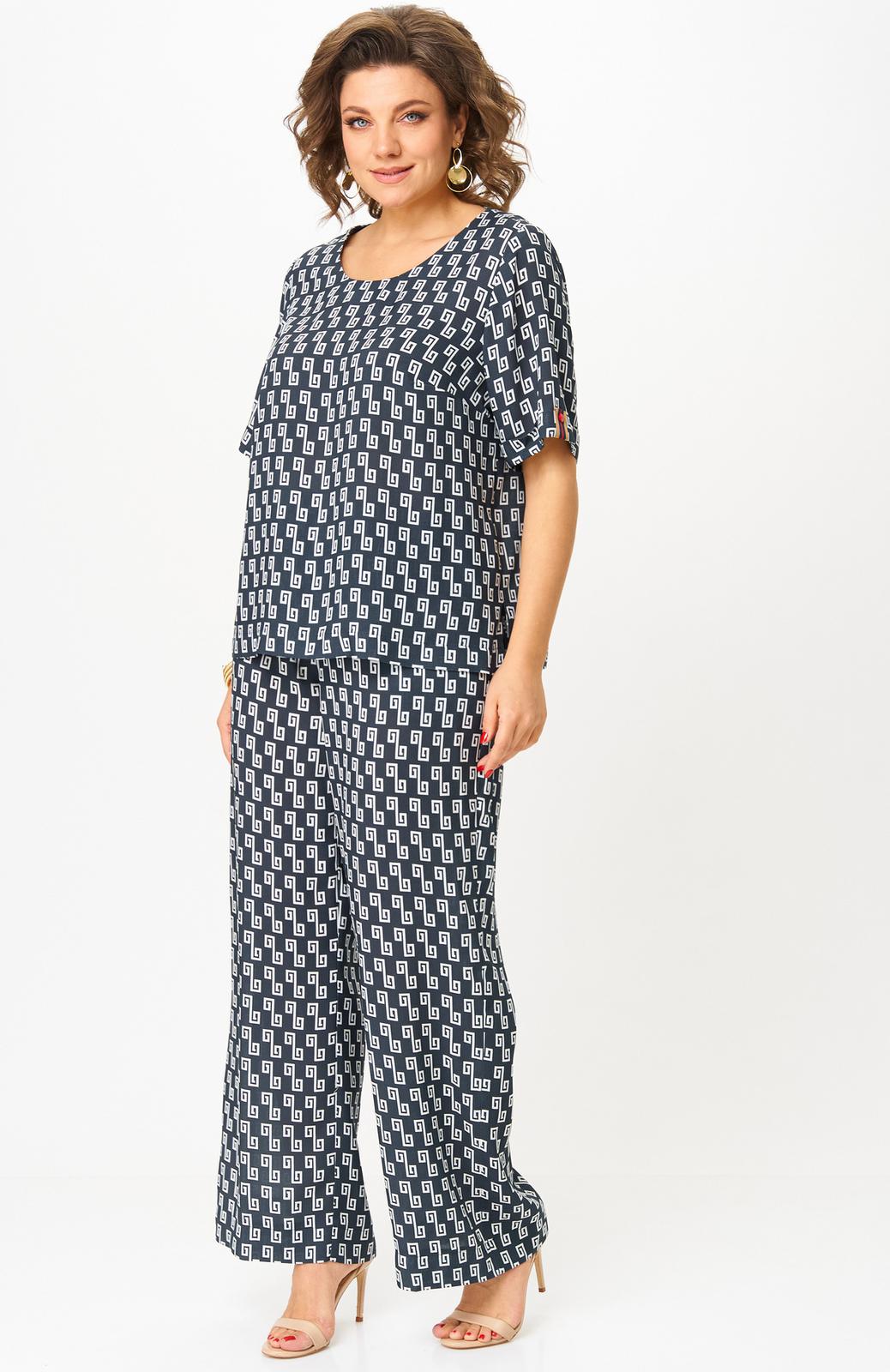Комплект женский-двойка, из текстильной ткани, в блузе по переду есть нагрудные вытачки, по боковым швам разрезы, рукав 3/4. Брюки модель-палаццо, в боковых швах карманы, пояс на резинке, длина по боковому шву 102 см, ширина внизу 31 см.