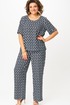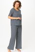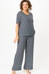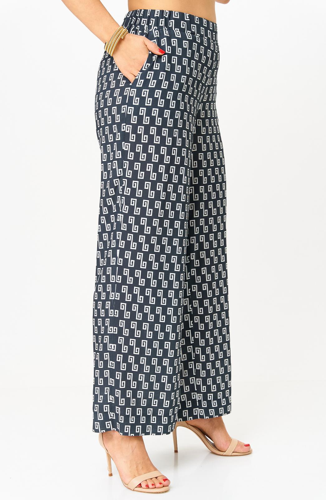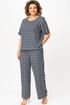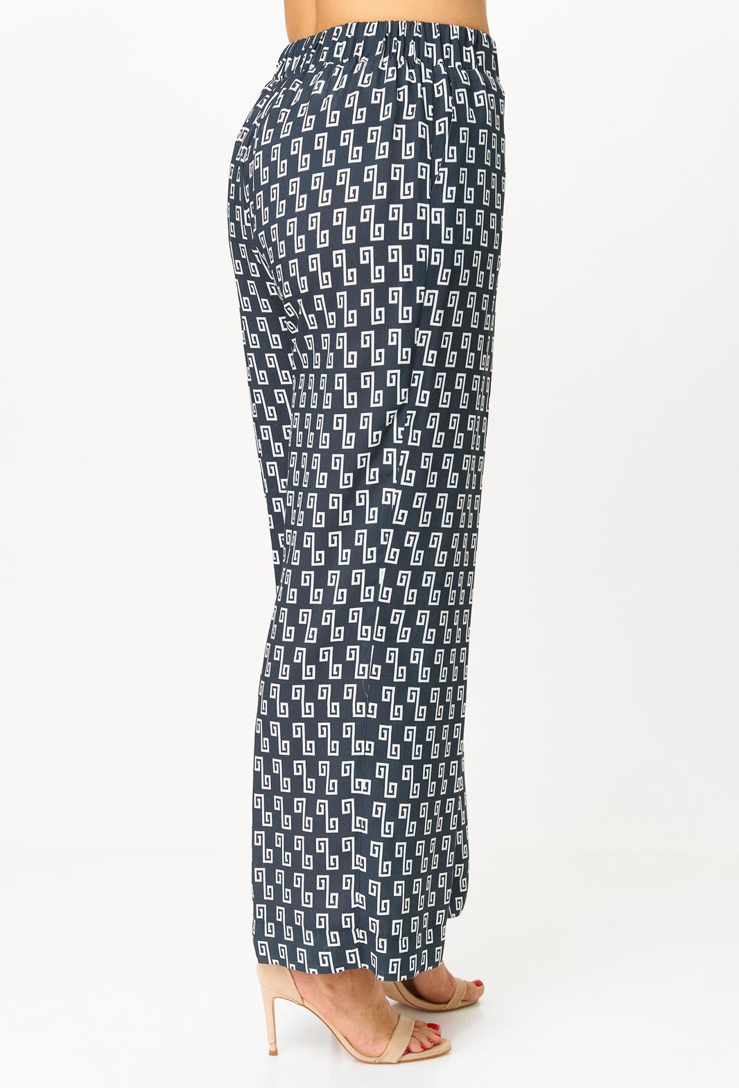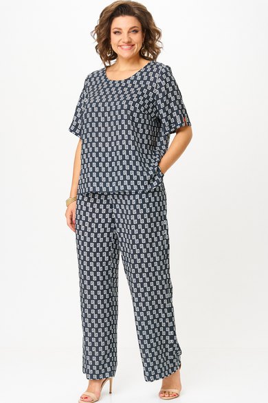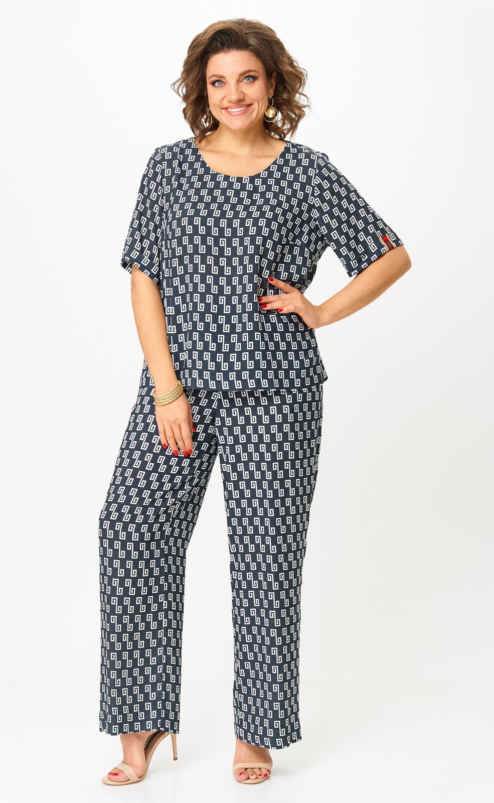 Комплект женский-двойка, из текстильной ткани, в блузе по переду есть нагрудные вытачки, по боковым швам разрезы, рукав 3/4. Брюки модель-палаццо, в боковых швах карманы, пояс на резинке, длина по боковому шву 102 см, ширина внизу 31 см.