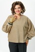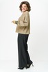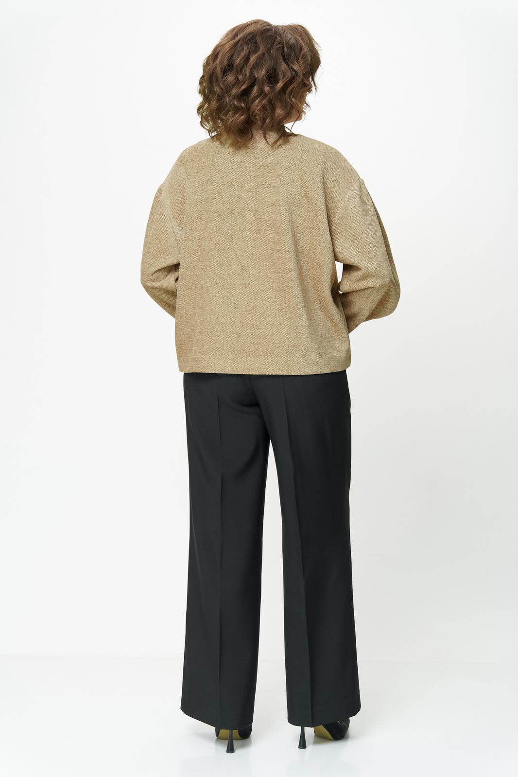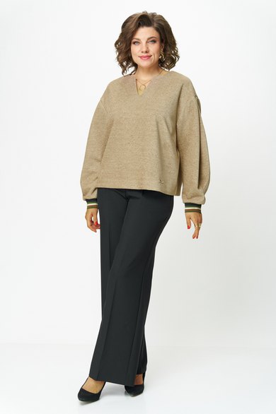 Комплект женский-двойка, блуза, свободного силуэта, из трикотажной ткани, вырез горловины V-образный,рукав немного спущенный, фигурный, спинка цельная. Длина по спинке 59 см Брюки-палаццо,средней ширины,из плотной текстильной ткани, выполнены с карманами с отрезным бочком в боковом шве. Пояс притачной, застёжка на молнию. По задним половинкам обработаны вытачки. Длина по боковому шву 108 см.