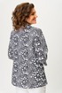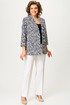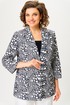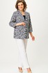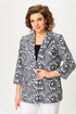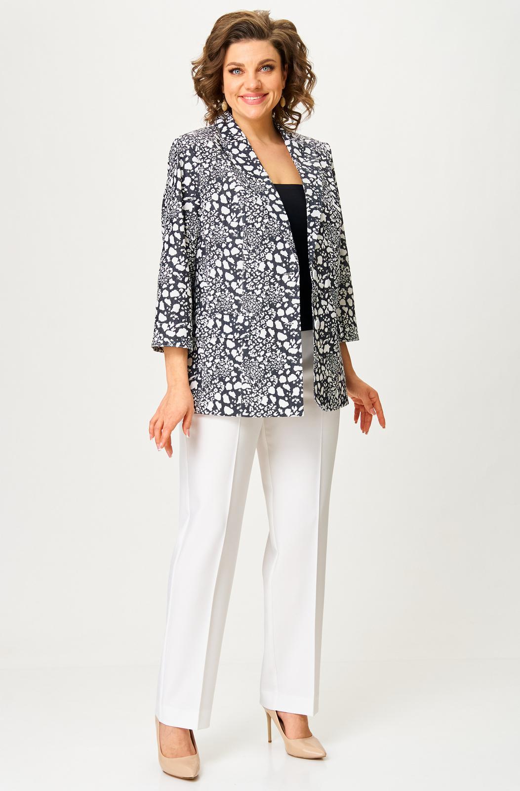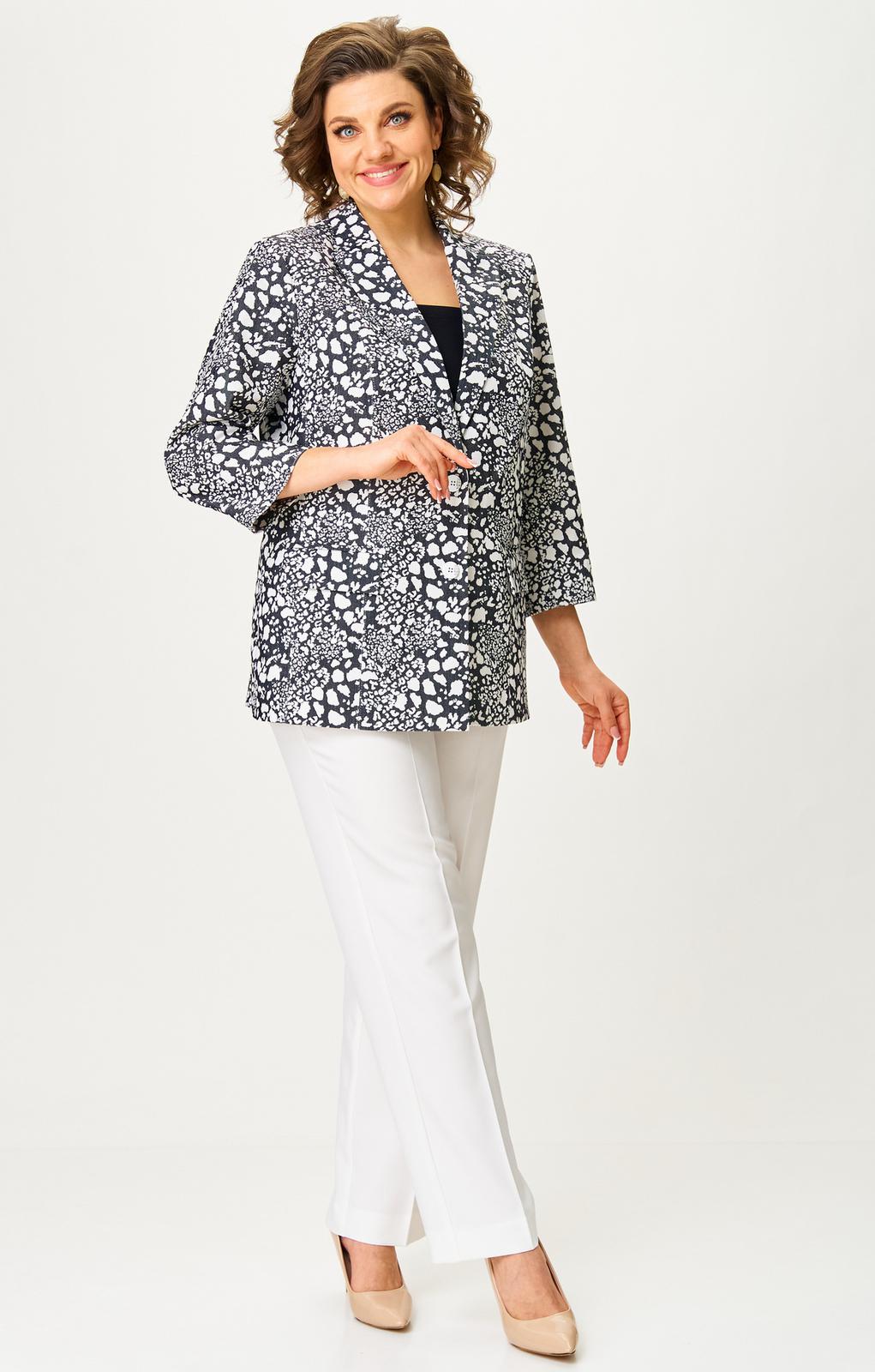 Жакет женский удлиненный, полуприлегающего силуэта с центральной бортовой застежкой на пуговицы до линии перегиба лацкана. Спереди рельефные швы от плечевого шва, отрезной бочок и карман с клапаном. Спинка с рельефами от плечевого шва. Рукав втачной, двухшовный, 3/4, с небольшим разрезом в локтевом шве. Воротник пиджачного типа. Перед жакета на подкладке. Длина рукава 50, длина по спинке 68 см.