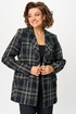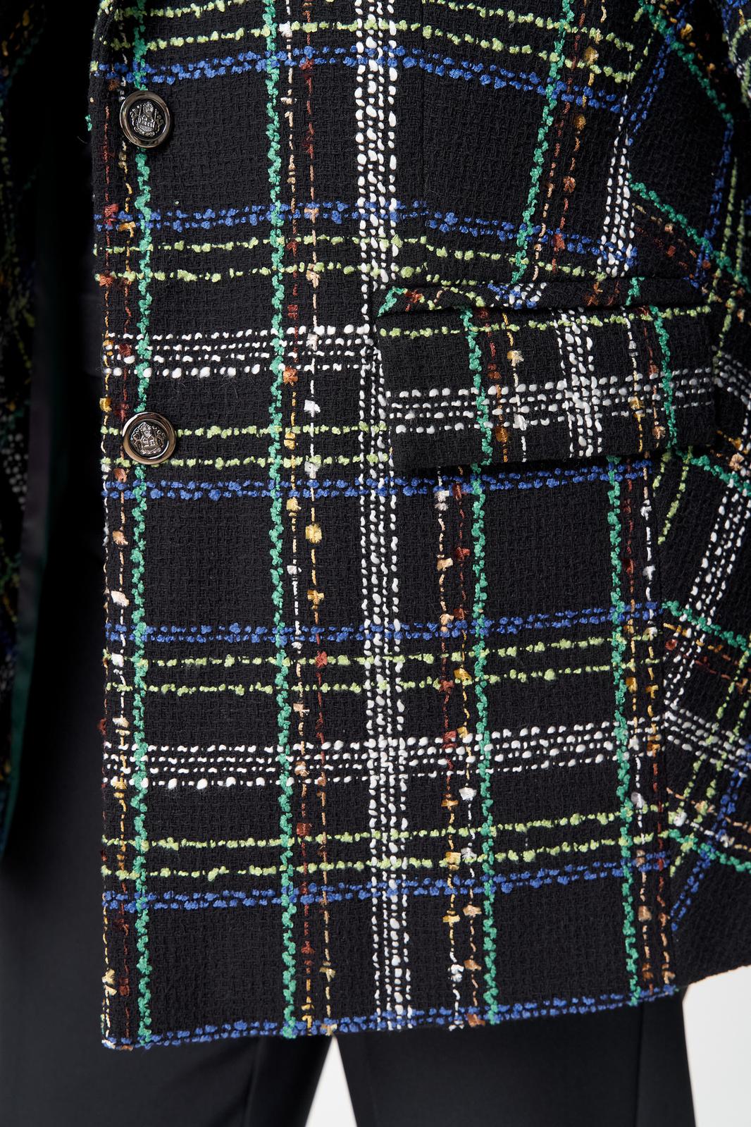 Жакет удлиненный, из твида, свободного силуэта с центральной бортовой застежкой на пуговицы до линии перегиба лацкана. По переду имеется отрезной бочок и вертикальные вытачки. С прорезными карманами с клапаном и двумя обтачками. Спинка цельная. Воротник пиджачного типа. Рукав двухшовный, втачной. Жакет на подкладке. Длина рукава 63 см, длина по спинке 75 см.