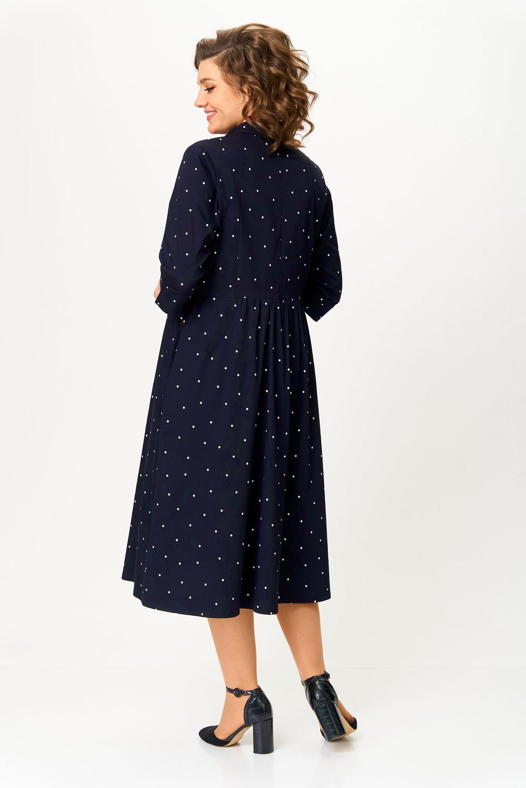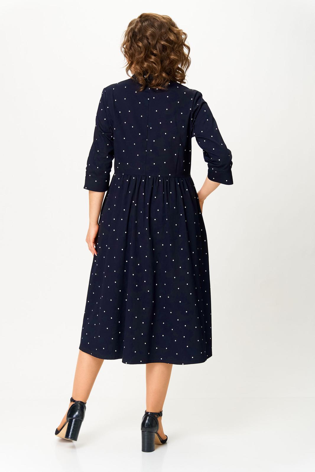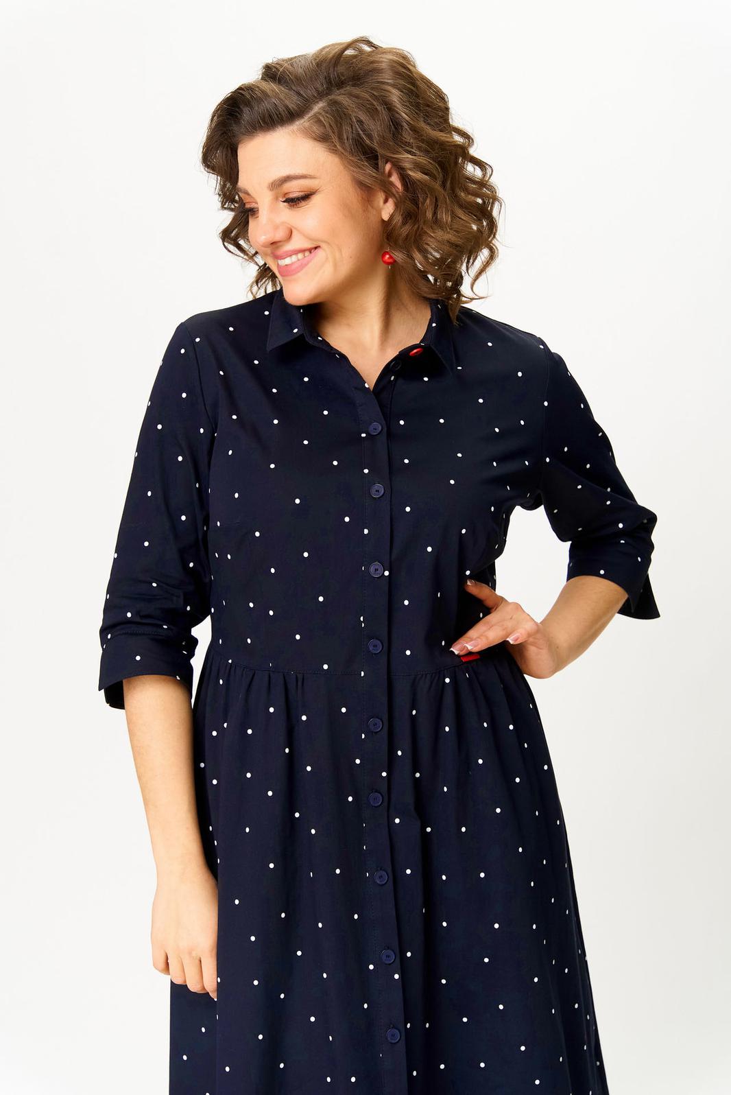 Платье женское, повседневное, полуприлегающего силуэта, отрезное по линии талии, длиной ниже линии колен, из хлопковой ткани. Перед с застежкой на пуговицы. Вырез горловины обработан воротником на стойке. Рукав втачной, по низу обработан цельнокроенной манжетой. Длина по спинке 117 см, длина рукава 16,5 см.