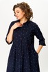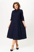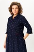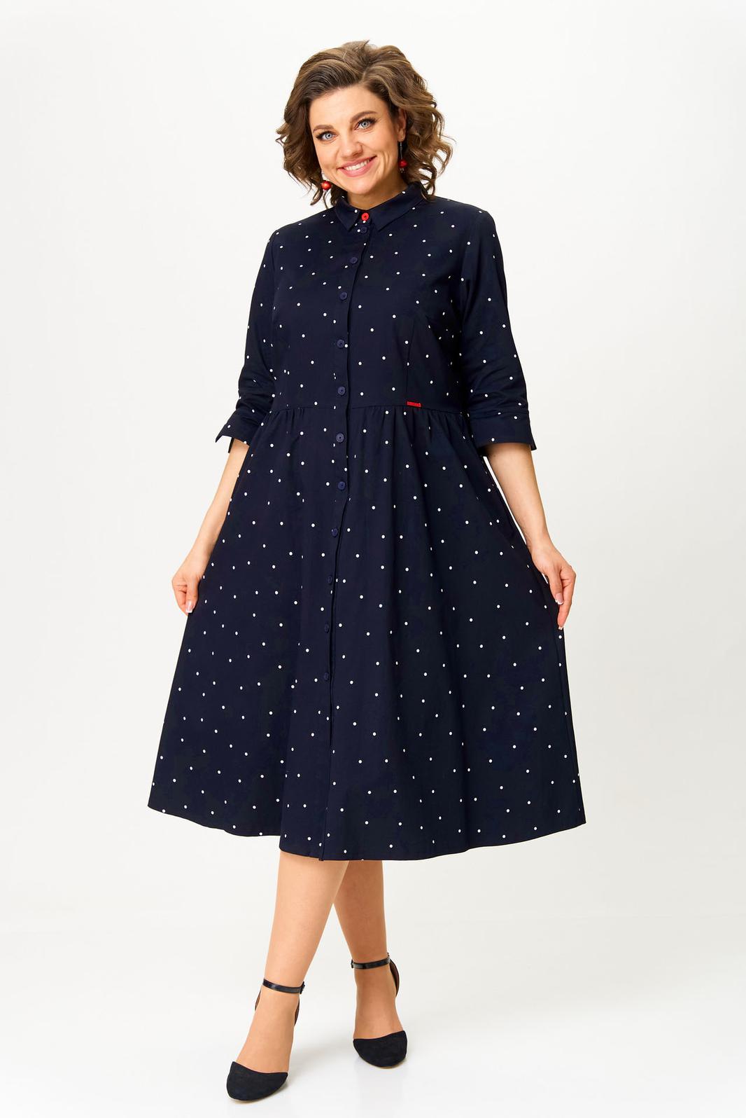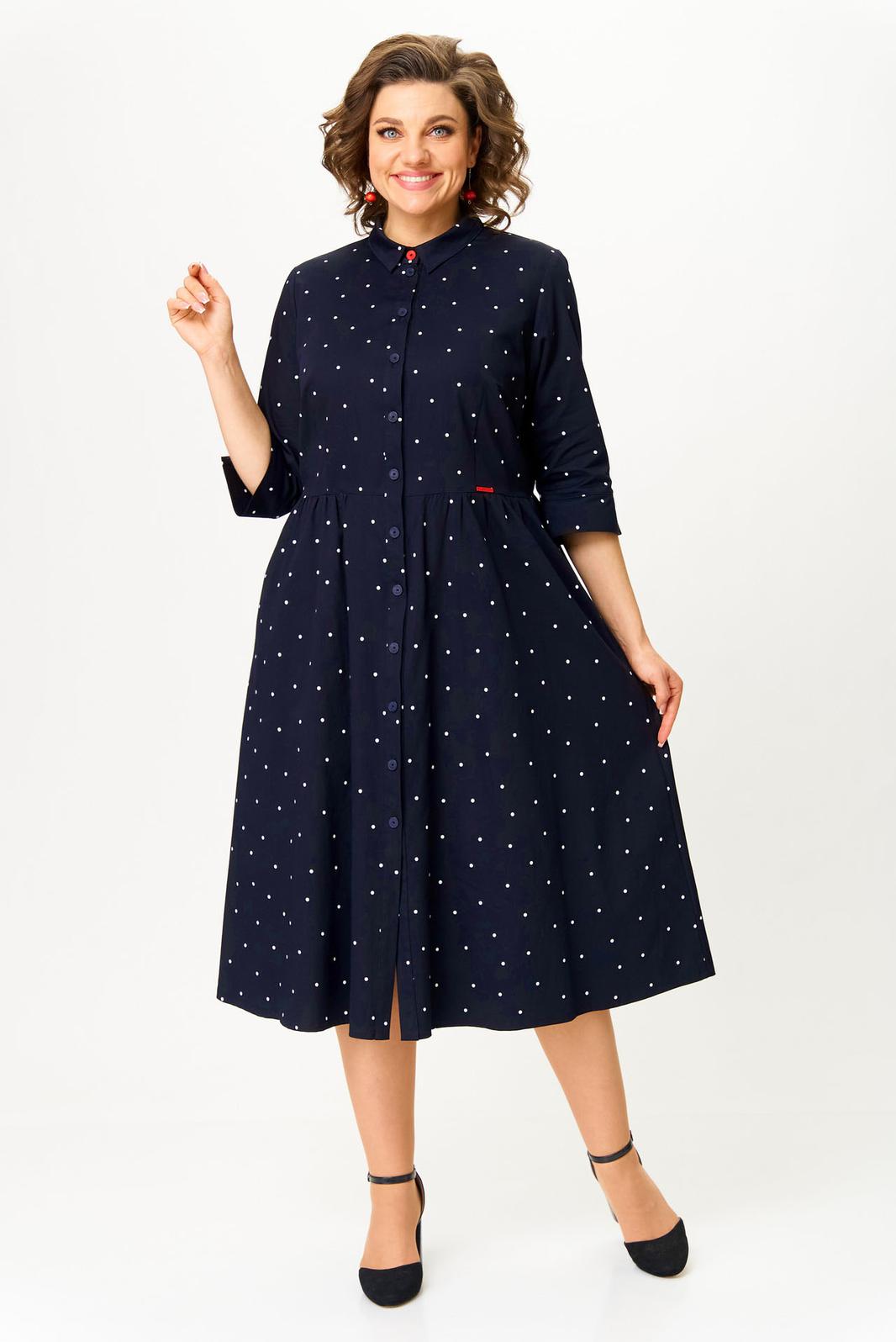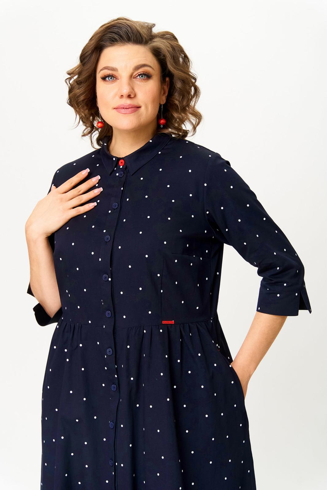 Платье женское, повседневное, полуприлегающего силуэта, отрезное по линии талии, длиной ниже линии колен, из хлопковой ткани. Перед с застежкой на пуговицы. Вырез горловины обработан воротником на стойке. Рукав втачной, по низу обработан цельнокроенной манжетой. Длина по спинке 117 см, длина рукава 16,5 см.