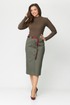 Юбка женская из хлопковой ткани. На подкладке, прямого силуэта, заужена к низу. Притачной пояс-кокетка, настрочены по переду накладные карманы и обработана по центру планка, которая заканчивается шлицей. Спинка со средним швом и талиевыми вытачками. В среднем шве застежка на потайную тесьму-молнию. К юбке прилагается пояс. Длина юбки по боковому шву 68 см.