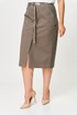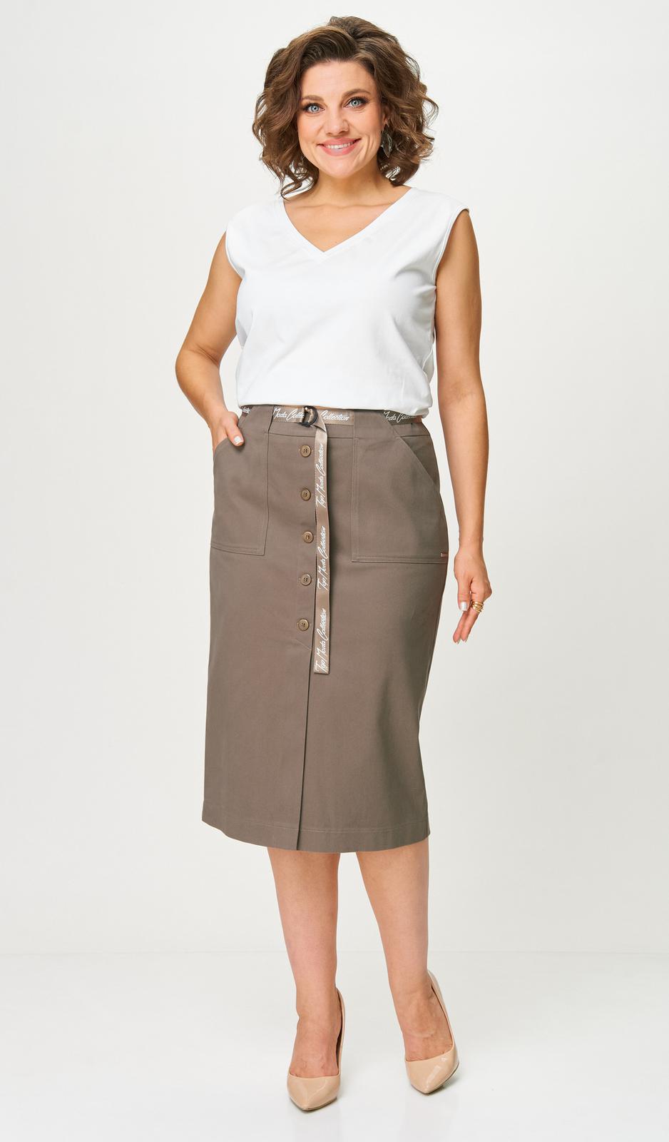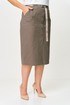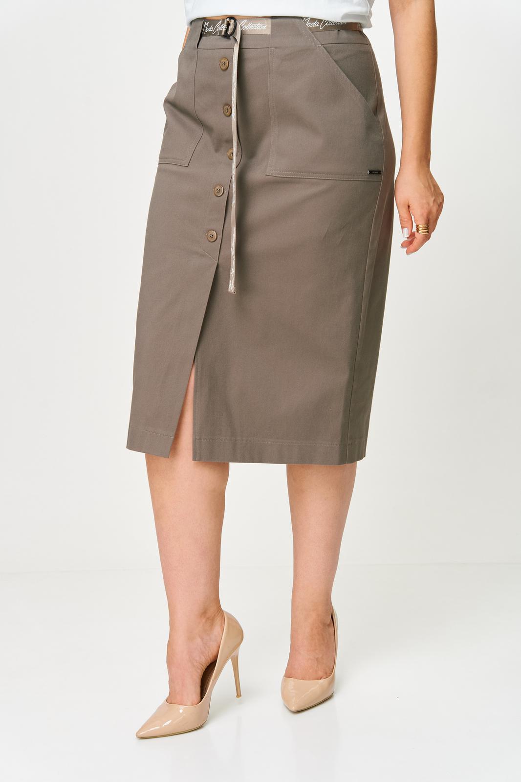 Юбка женская из хлопковой ткани. На подкладке, прямого силуэта, заужена к низу. Притачной пояс-кокетка, настрочены по переду накладные карманы и обработана по центру планка, которая заканчивается шлицей. Спинка со средним швом и талиевыми вытачками. В среднем шве застежка на потайную тесьму-молнию. К юбке прилагается пояс. Длина юбки по боковому шву 68 см.