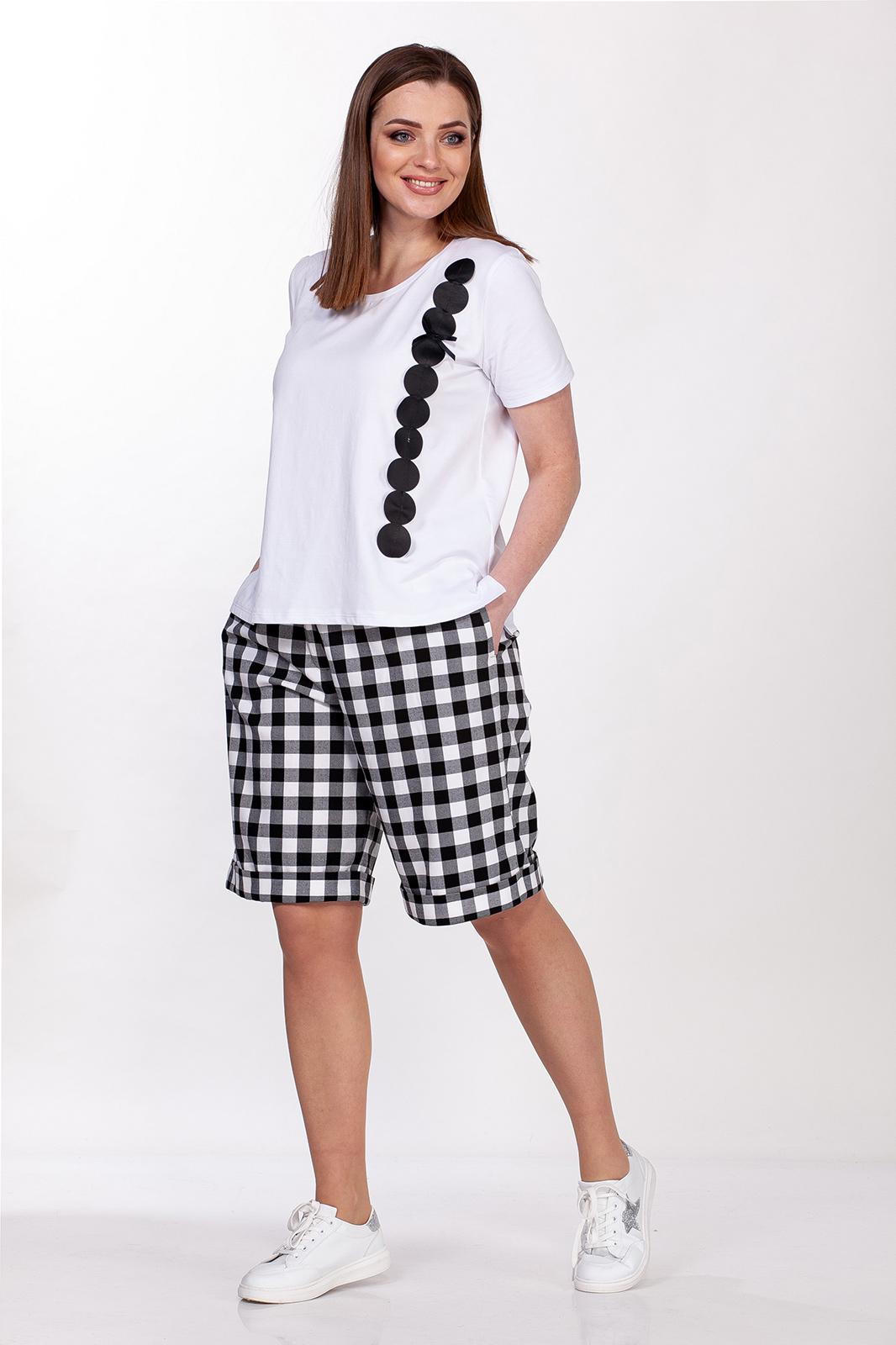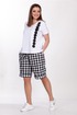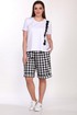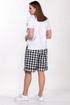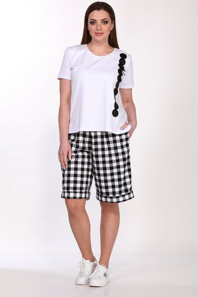 Комплект женский двухпредметный состоит из майки и шорт. Майка женская полуприлегающего силуэта выполнена из вискозы. Горловина круглая с притачной планкой, рукав втачной короткий, полочка украшена аппликацией. Длина майки- 62 см. Шорты с высокой посадкой, выполнены из костюмной ткани в клетку с добавлением спандекса. Пояс без резинки, с застежкой молнией на пуговицу. В боковых швах карманы с листочкой, по низу манжет с отворотом, длина- 56 см.