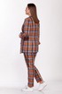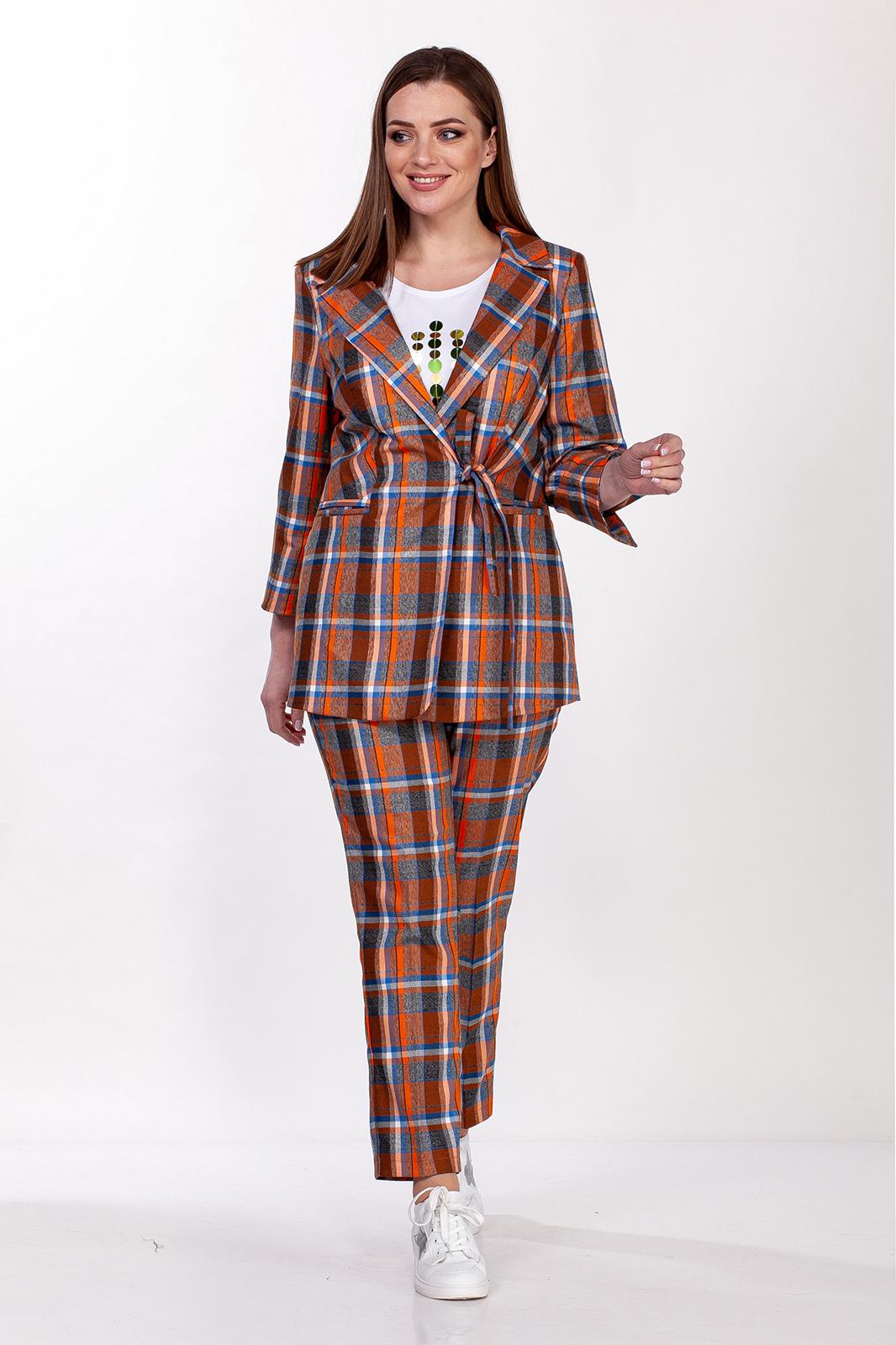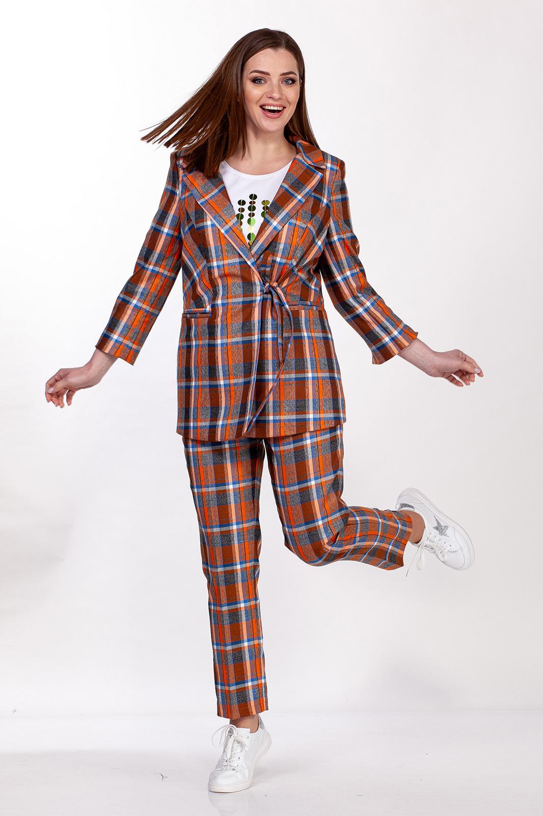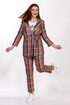 Комплект женский двухпредметный состоит из жакета и брюк. Жакет полуприлегающего силуэта выполнен из костюмной ткани в клетку с добавлением эластана на подкладке. Воротник втачной с отложным лацканом, рукав двухшовный с разрезом, на полочке обработаны функциональные карманы с листочкой. Застегивается на завязки, длина жакета 75 см, длина рукава 53 см. Брюки классические с высокой посадкой, полуприлегающего силуэта, выполнены из плотной костюмной ткани в клетку с добавлением эластана. Пояс без резинки, с застежкой молнией на пуговицу. В боковых швах карманы с листочкой. Длина брюк 103 см.