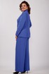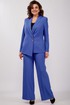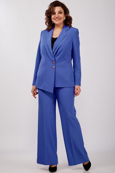Длина жакета по спинке – 68 см. Длина рукава – 60 см. Длина брюк по боковому шву – 112 см. Длина брюк по шаговому шву – 80,5 см. Стильный женский костюм, выполнен в классическом стиле. Жакет полуприлегающего силуэта, по переду отрезной по линии талии, лиф со складочками, застежка смещенная на петли пуговицы, горловина с отложным лацканом и воротником пиджачного типа. Спинка с центральным швом и рельефами. Рукава втачные двухшовные, по низу шлица с пуговицами. Низ жакета по переду асимметричный, правая часть выполнена углом. Жакет на подкладке. Брюки свободного силуэта со складочками по переду, по боковым швам на уровне талии, наклонные карманы с подкройным бочком. Застежка на молнию по линии банта. Верх брюк обработан поясом со шлевками. В комплект входит ремень из основной ткани , ремень с пряжкой.