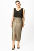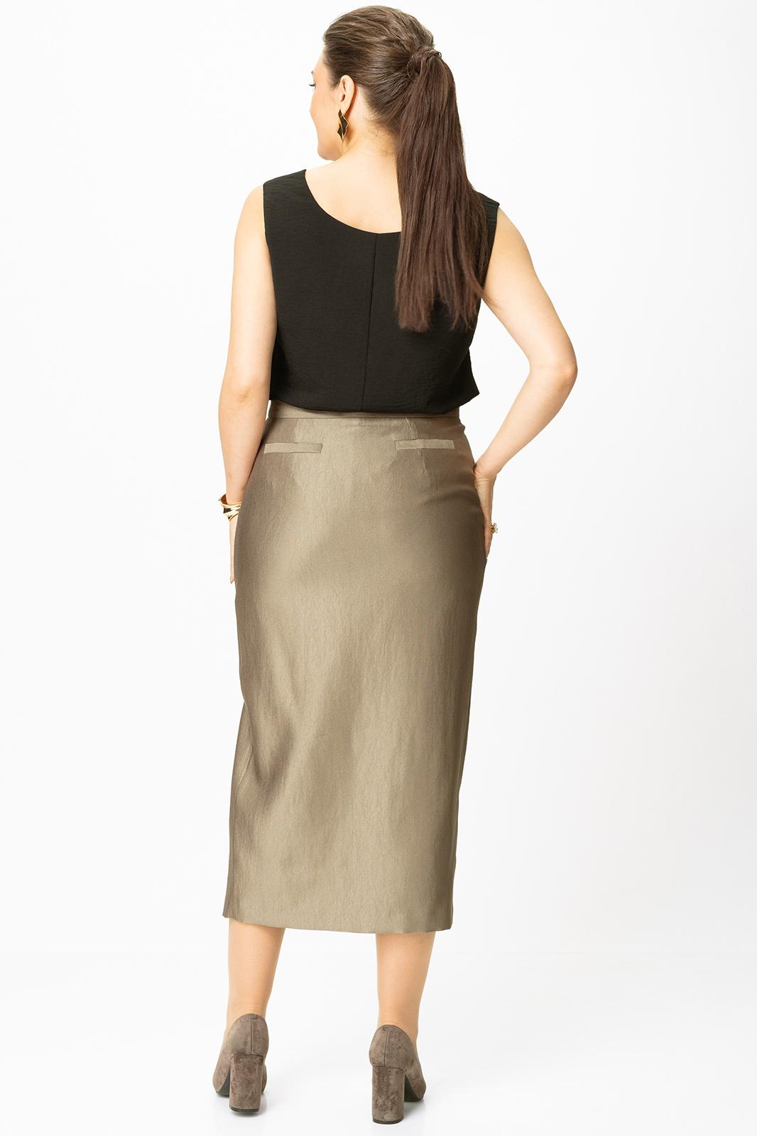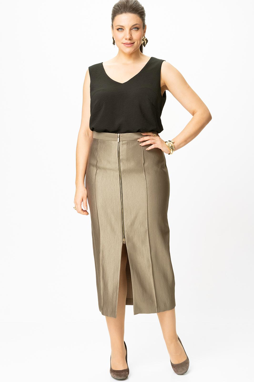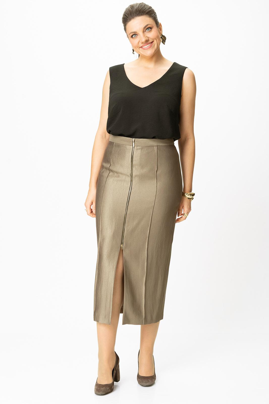 Юбка прилегающего силуэта, заужена к низу, по переде застрочены рельефные швы, застежка на декоративную молнию по центру переда. Верх юбки на притачной поясе.