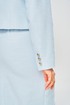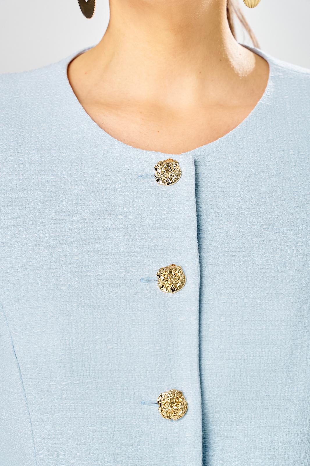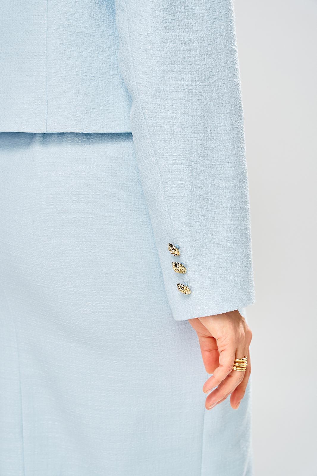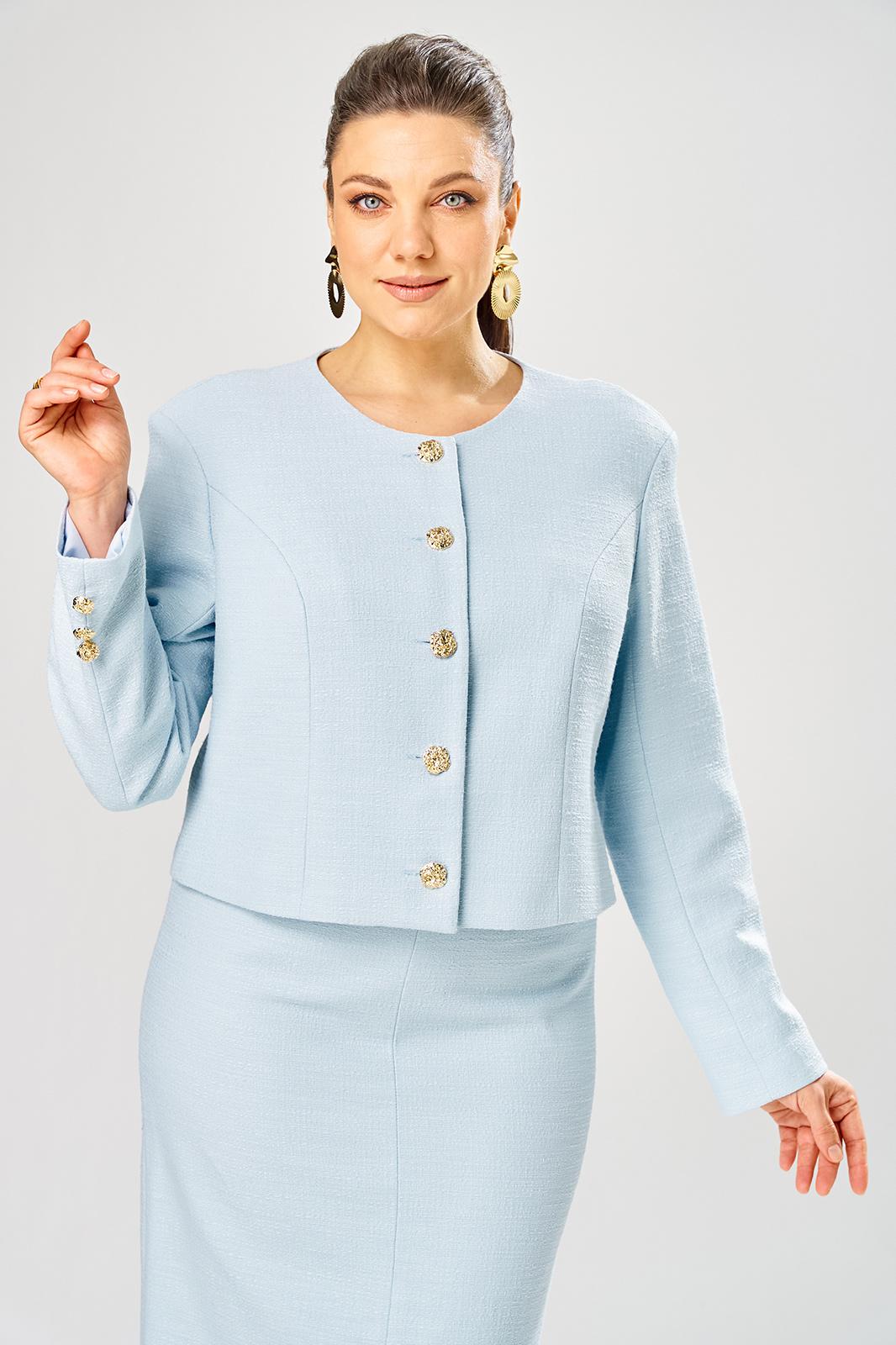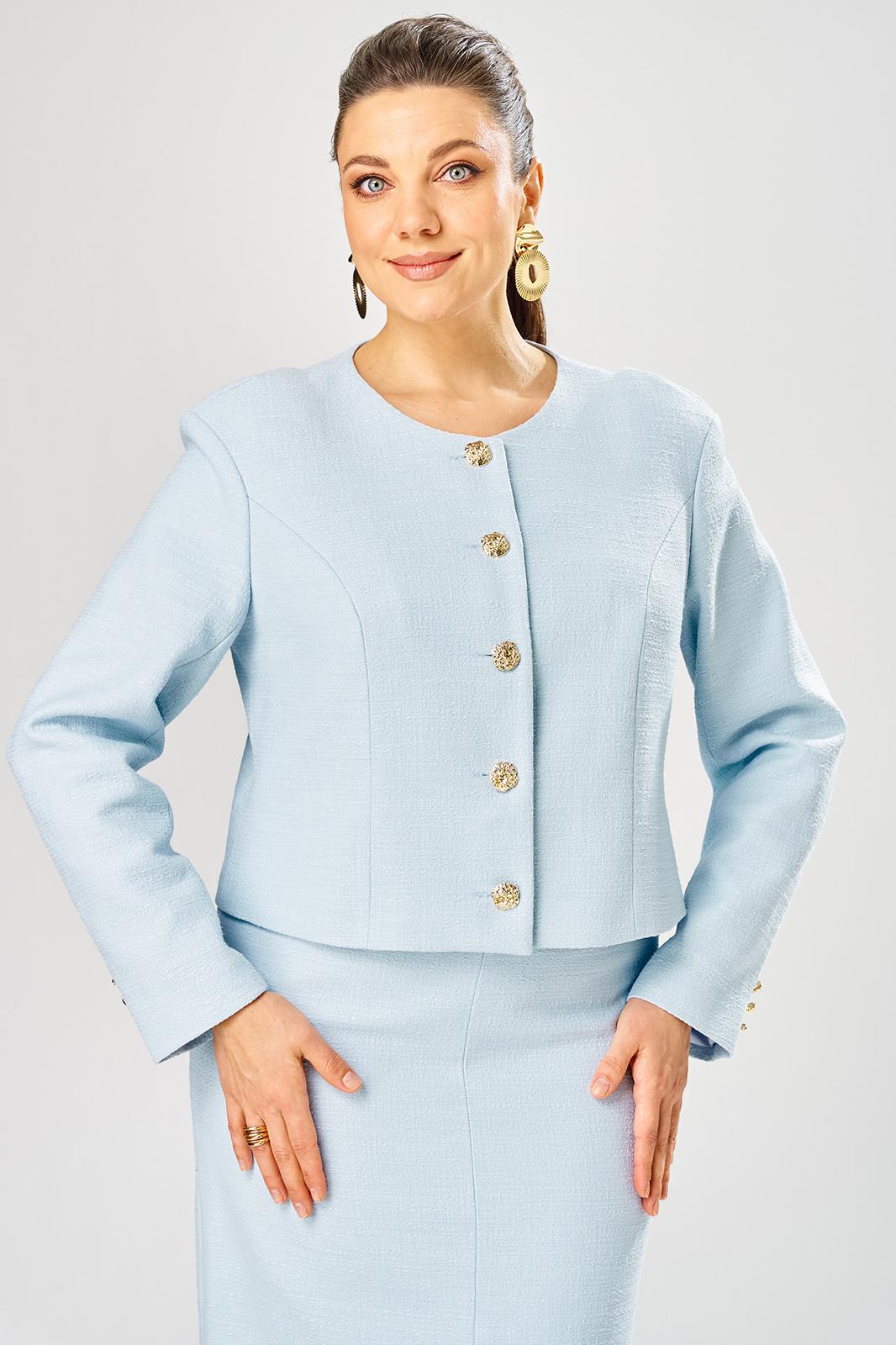 Жакет укороченный, прямого силуэта. Застежка центральная на петли пуговицы, горловина круглая. В жакете удлиненная линия плеча, рукава втачные, длинные, в локтевом шве, низу декоративные пуговицы.