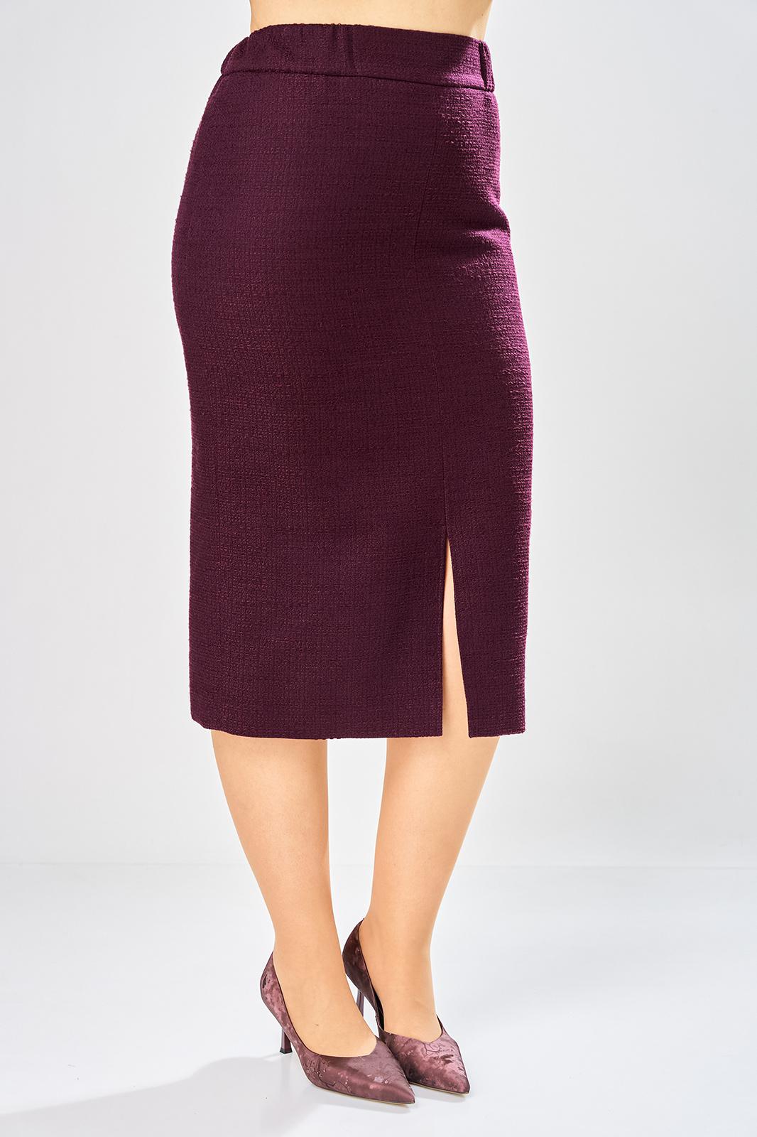 Юбка карандаш, актуальной длины до середины икры. По переду и спинке центральные швы, в переднем шве по низу разрез, по спинке застежка молния, верх юбки оформлен отрезным поясом. Юбка на подкладке.