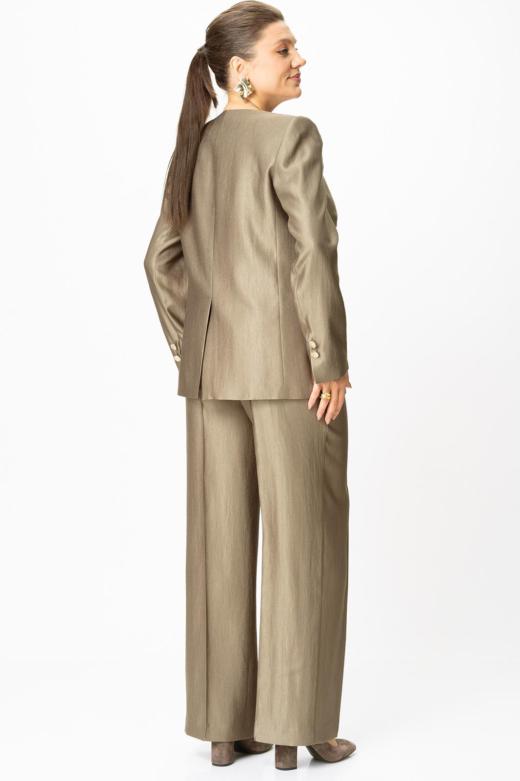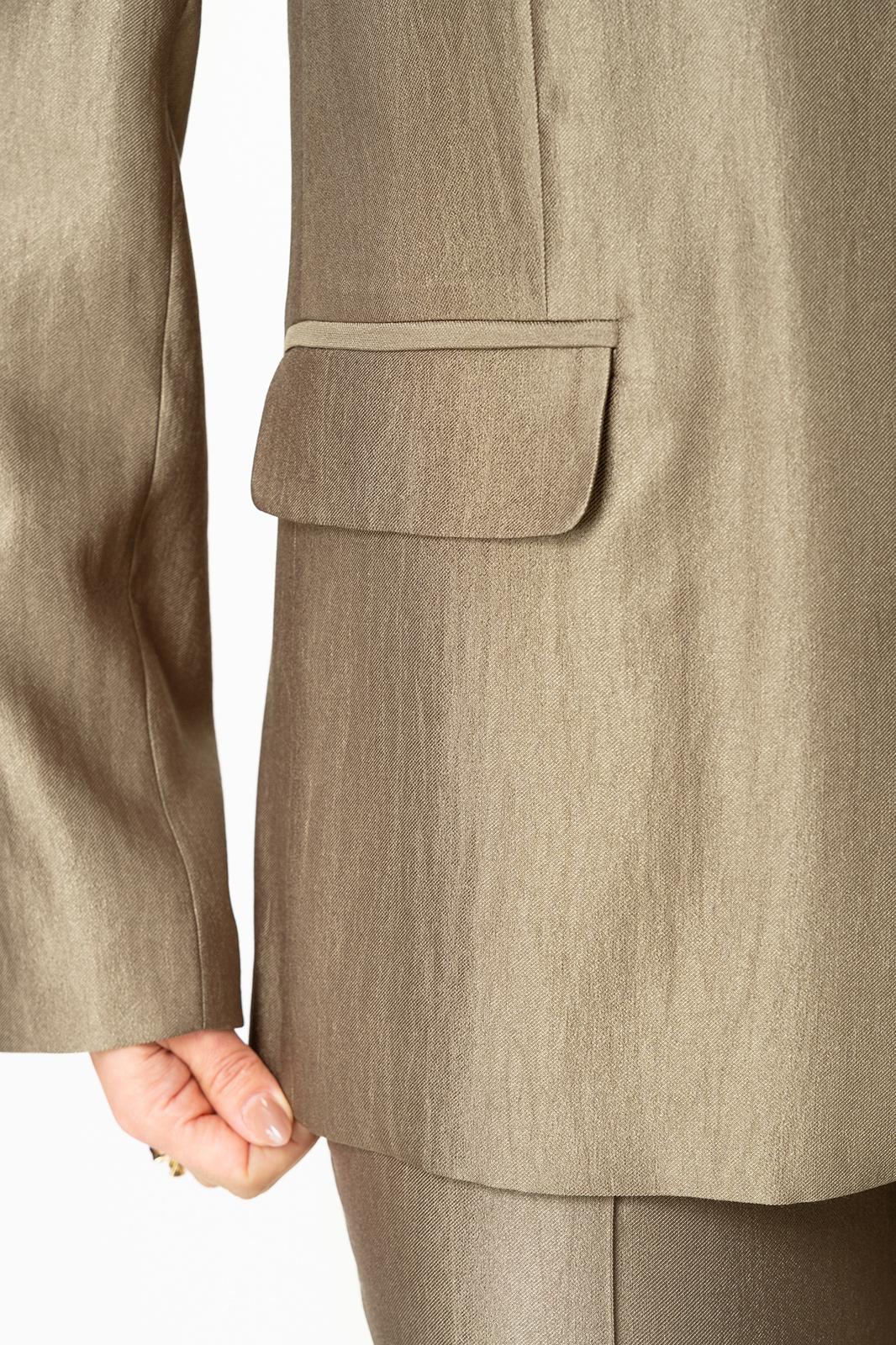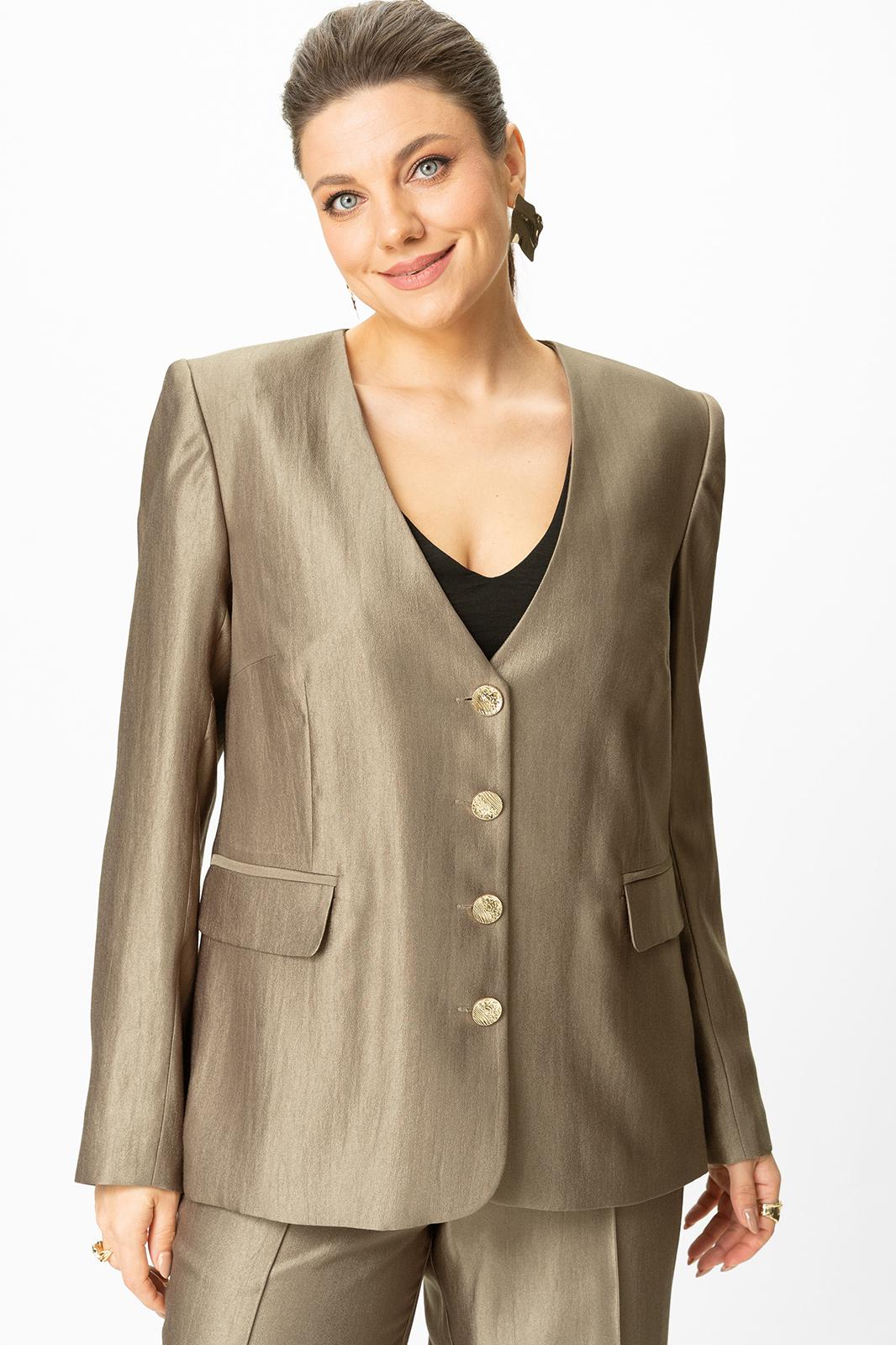 Жакет полуприлегающего силуэта, по переду прорезные карманы с клапаном. Горловина «V» образная, застежка центральная на петли-пуговицы. По спинке в центральном шве отлетная шлица по низу. Рукава втачные, по низу отлетная шлица с декором из пуговиц.