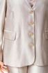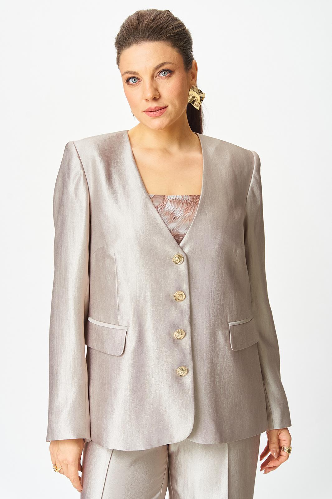 Жакет полуприлегающего силуэта, по переду прорезные карманы с клапаном. Горловина «V» образная, застежка центральная на петли-пуговицы. По спинке в центральном шве отлетная шлица по низу. Рукава втачные, по низу отлетная шлица с декором из пуговиц.