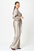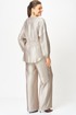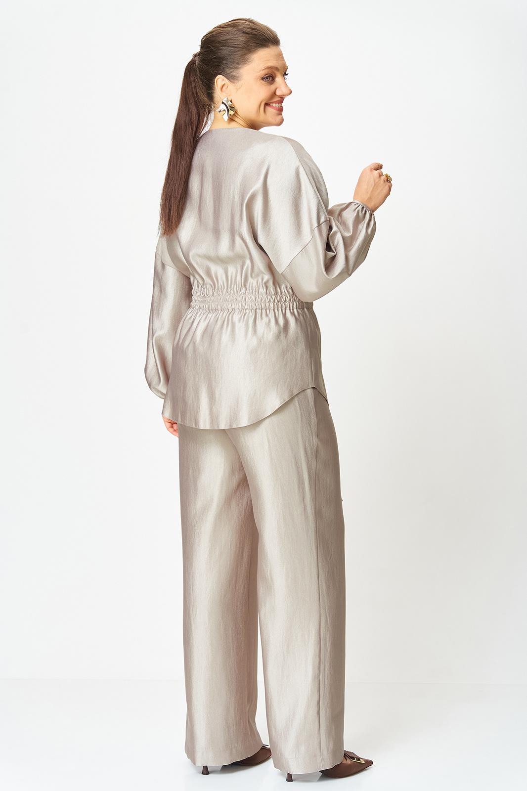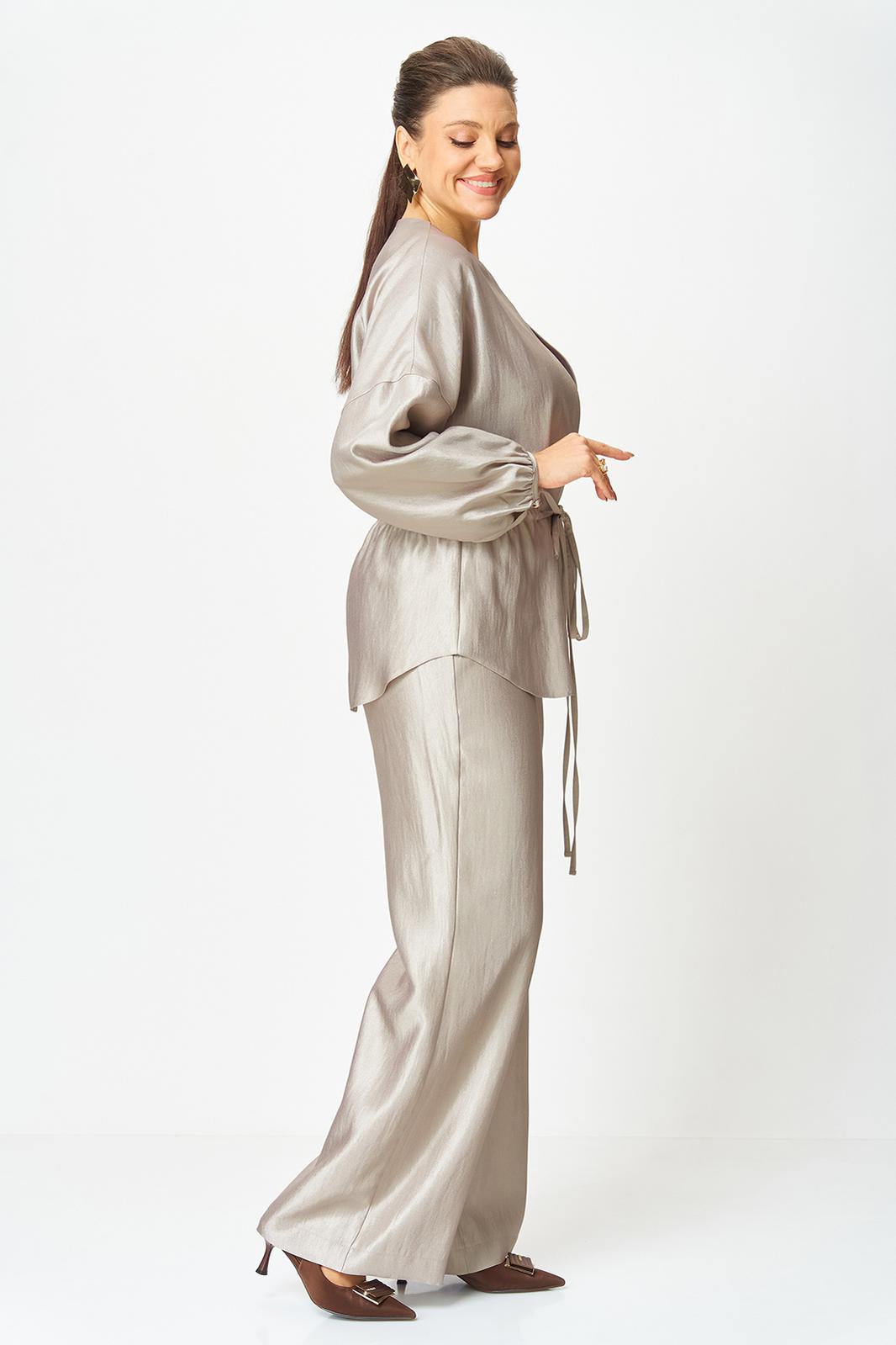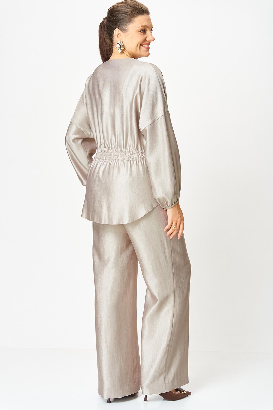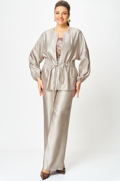 Стильный женский костюм выполнен из ткани с небольшим блеском.