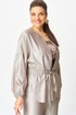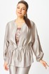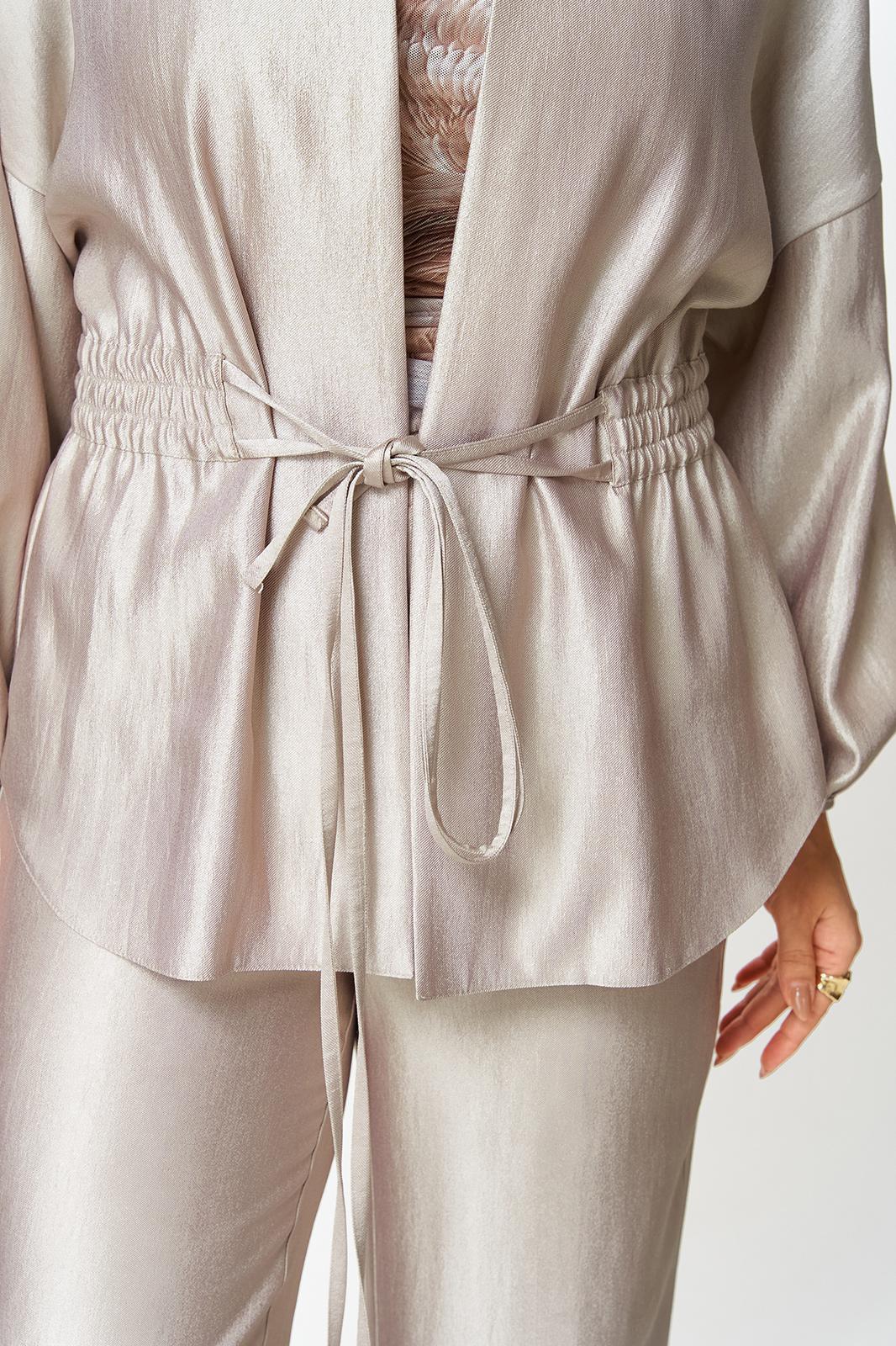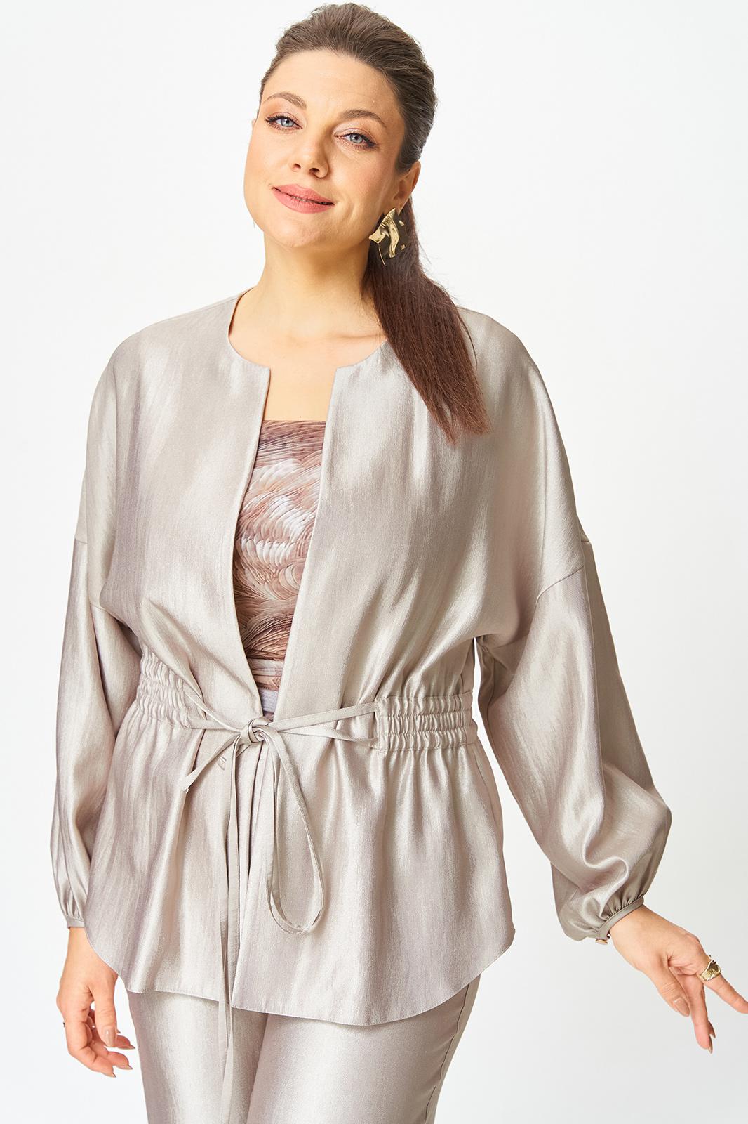 Жакет свободного силуэта со спущенной линией плеча, горловина круглая. Жакет без застежки, фиксируется на уровне талии завязками. Рукава 3/4, со сборкой по низу. Жакет без подкладки.