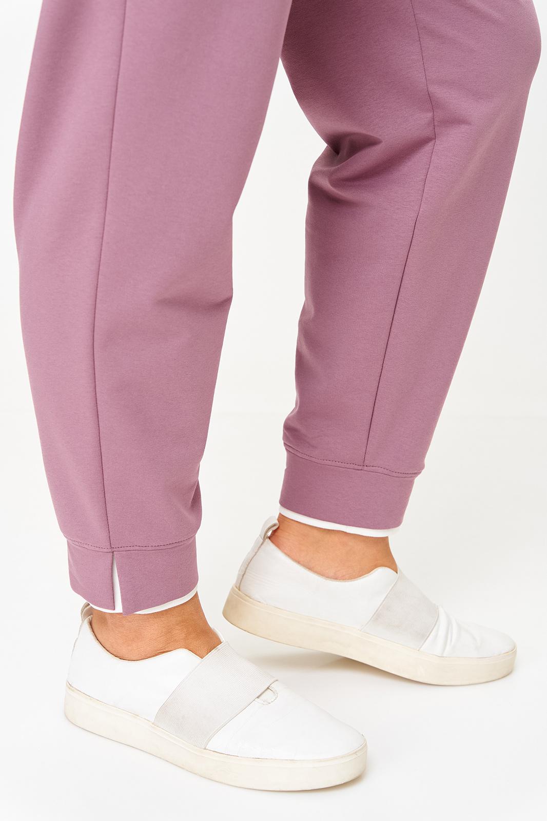 Брюки зауженные к низу с боковыми карманами. По низу двойной притачной манжет, нижний манжет из отделочной ткани. Верх брюк на резинке.