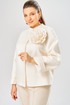 Горловина с цельновыкроенной стойкой, рукав реглан. Низ рукава и низ изделия с вытрепанным краем.