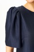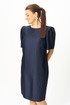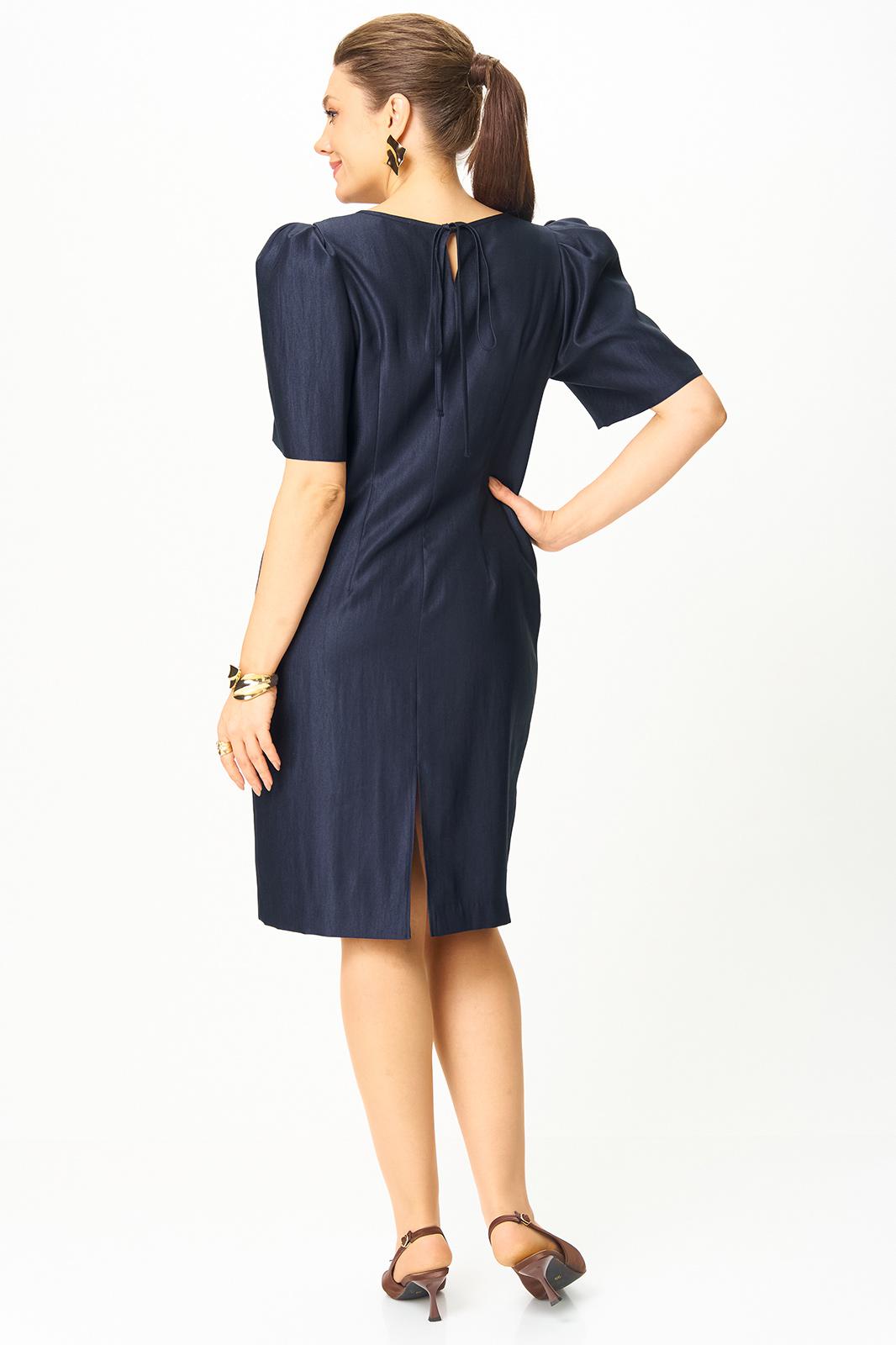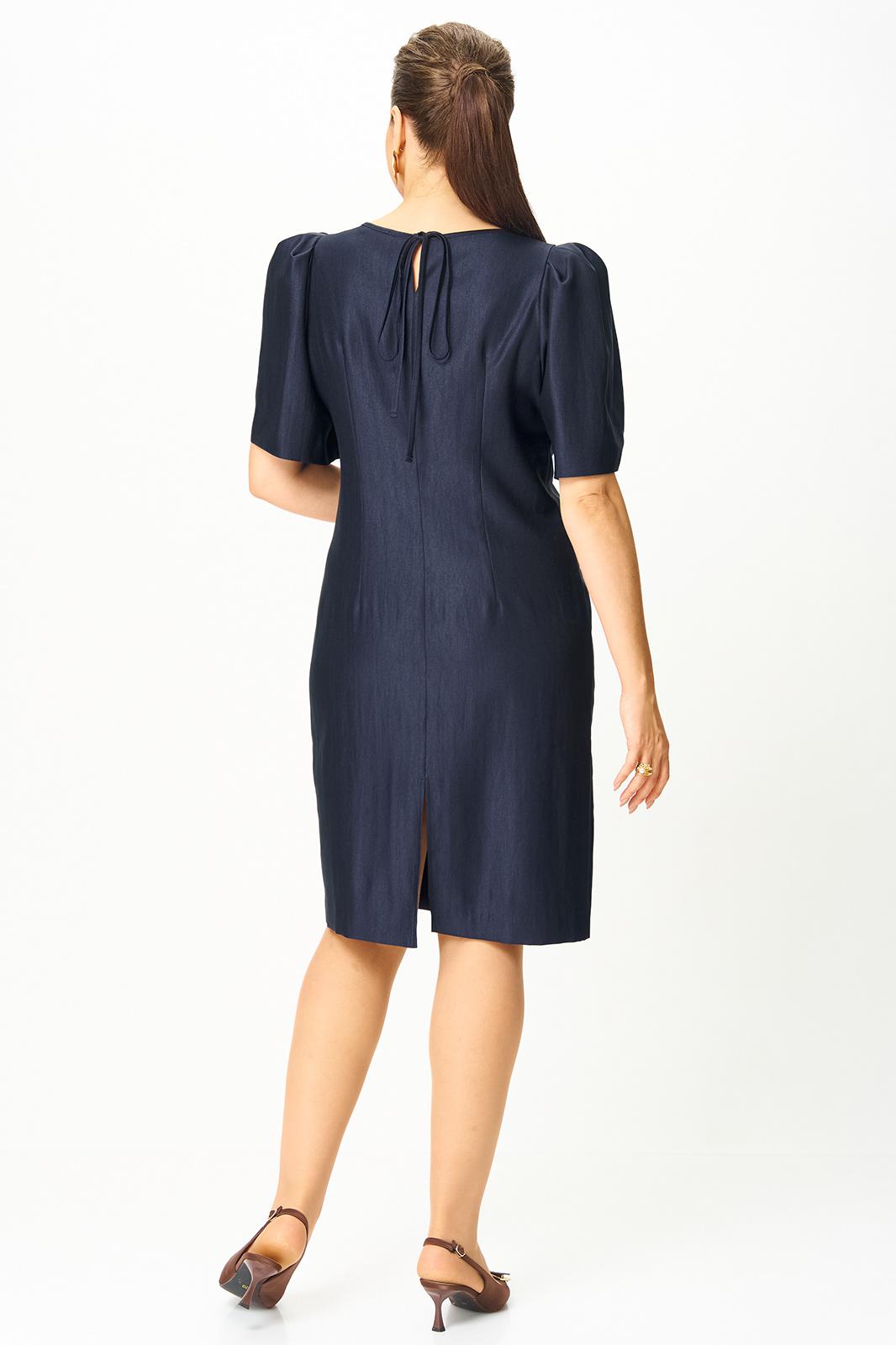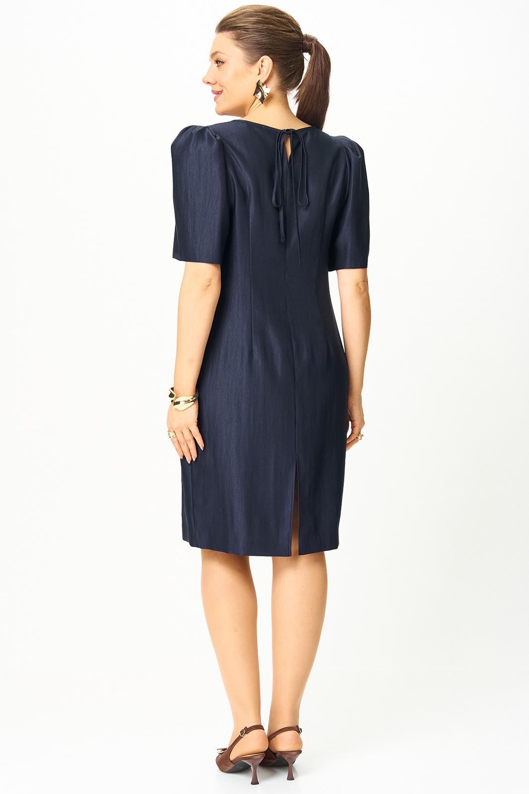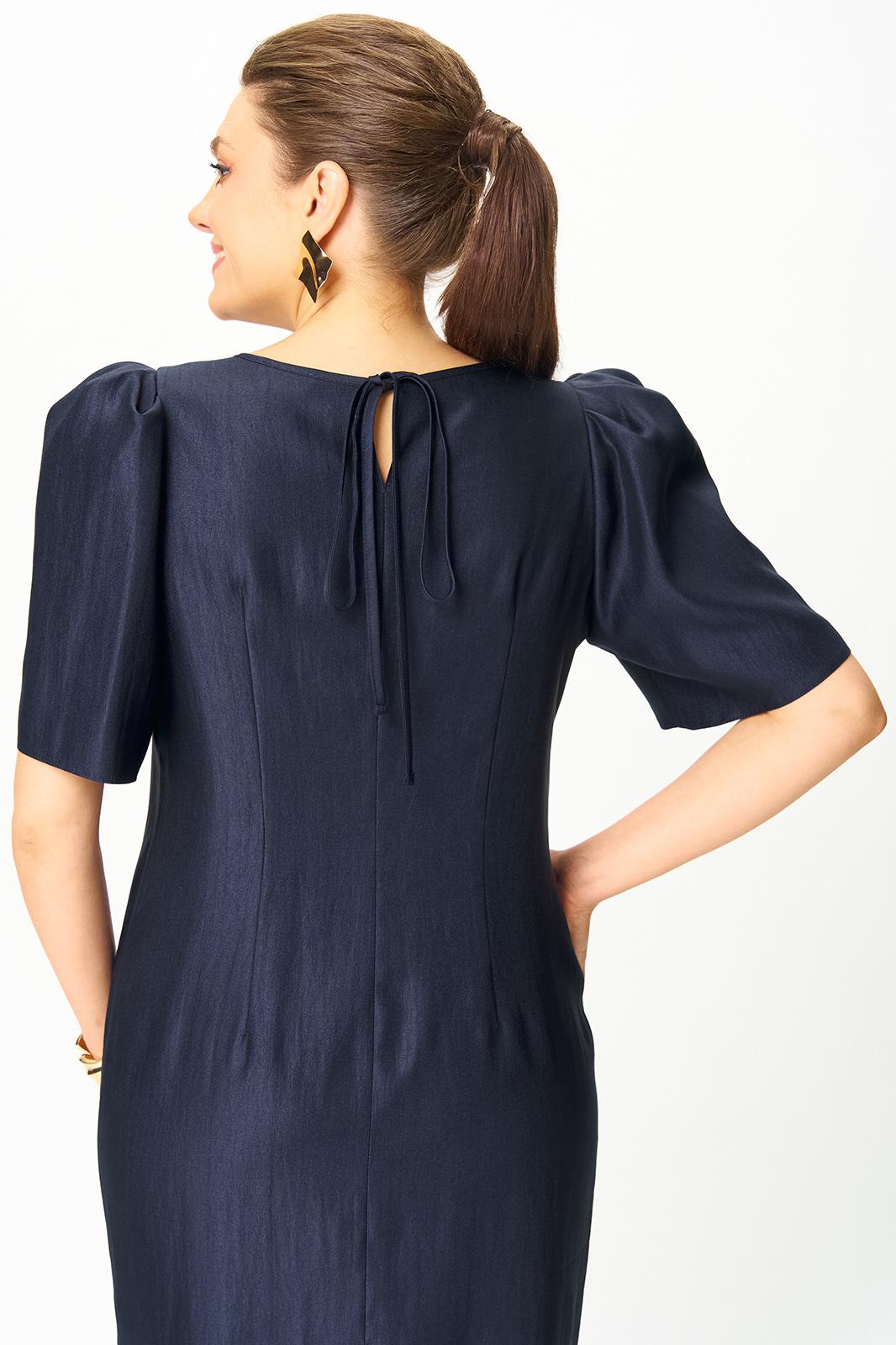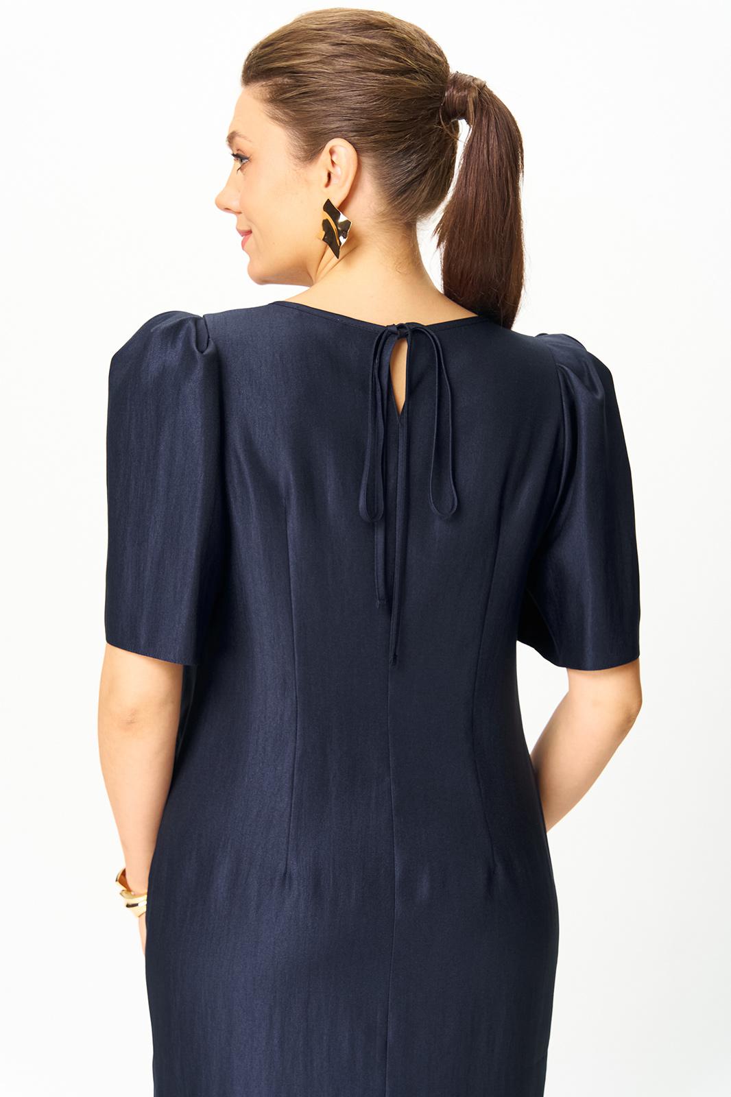 Платье полуприлегающего силуэта, горловина круглая. По спинке в центральном шве разрез возле горловины с завязкой и разрез по низу.