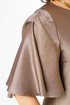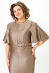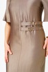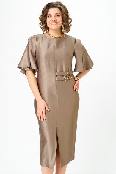 Платье прилегающего силуэта. Горловина круглая, по центру переда шов, по низу шва разрез, с левой стороны по линии талии декоративный элемент. Рукава втачные, фантазийной формы.