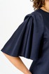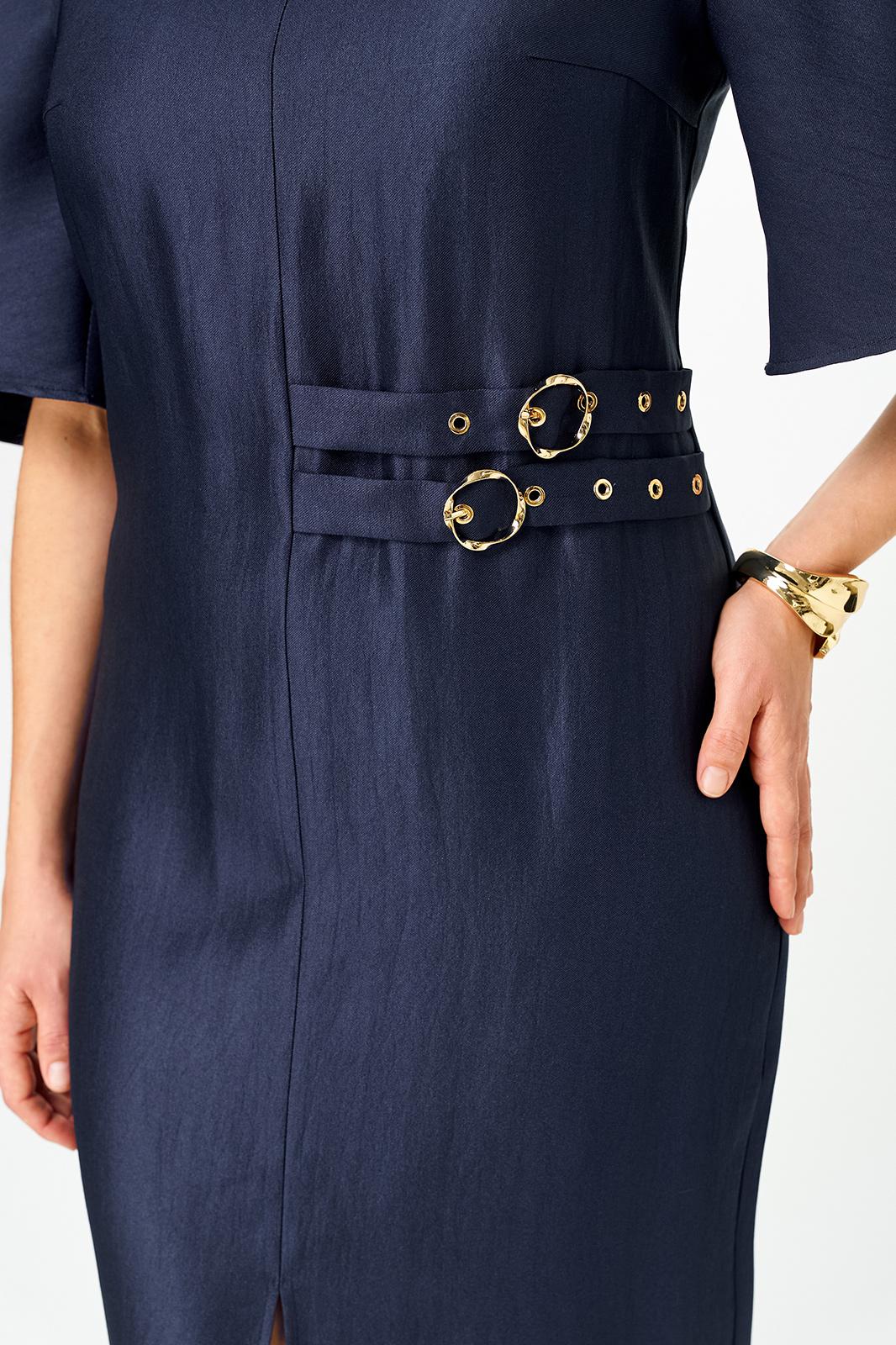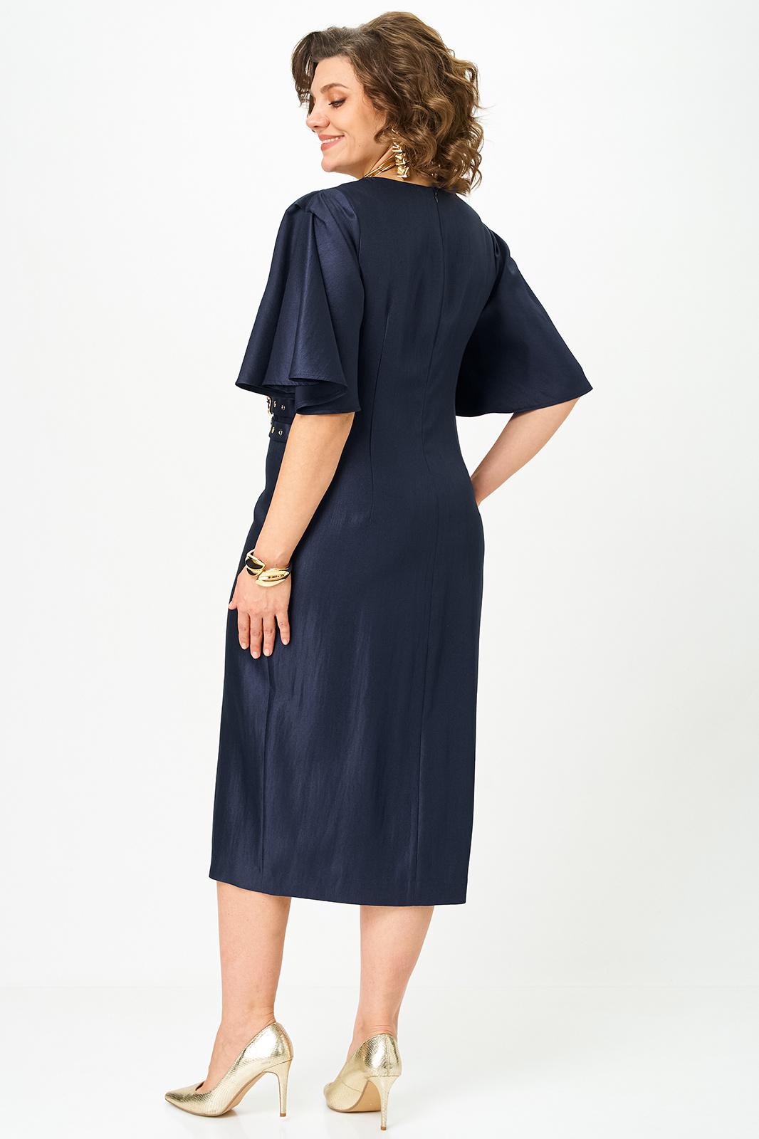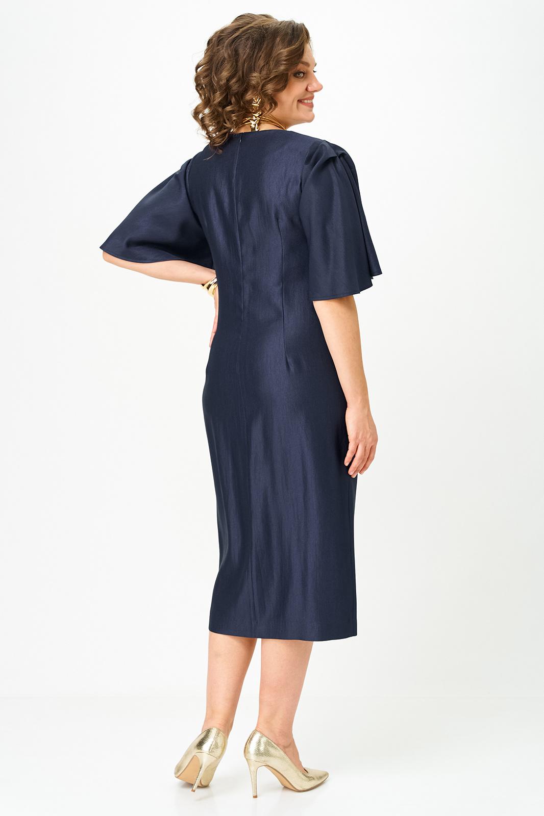 Платье прилегающего силуэта. Горловина круглая, по центру переда шов, по низу шва разрез, с левой стороны по линии талии декоративный элемент. Рукава втачные, фантазийной формы.