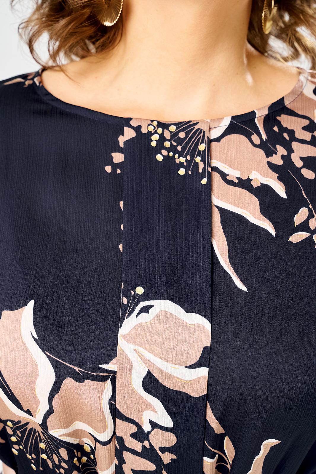 Платье полуприлегающего силуэта, отрезное по линии талии, по центру переда заложена широкая складка, горловина круглая.