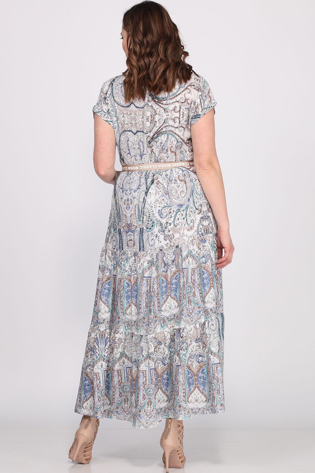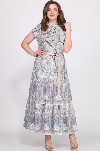 Стильное женское платье, полуприлегающего силуэта, выполнено из «французского» штапеля. Платье отрезное по линии бедер с притачными воланами со сборкой. По переду планка с петлями пуговицами, горловина оформлена рубашечным воротником с отрезной стойкой, на уровне груди накладной карман с отделочной тесьмой. Рукава спущенные короткие, по низу притачные манжеты. В комплект входит ремень из отделочной декоративной тесьмы. Платье без подкладки.
