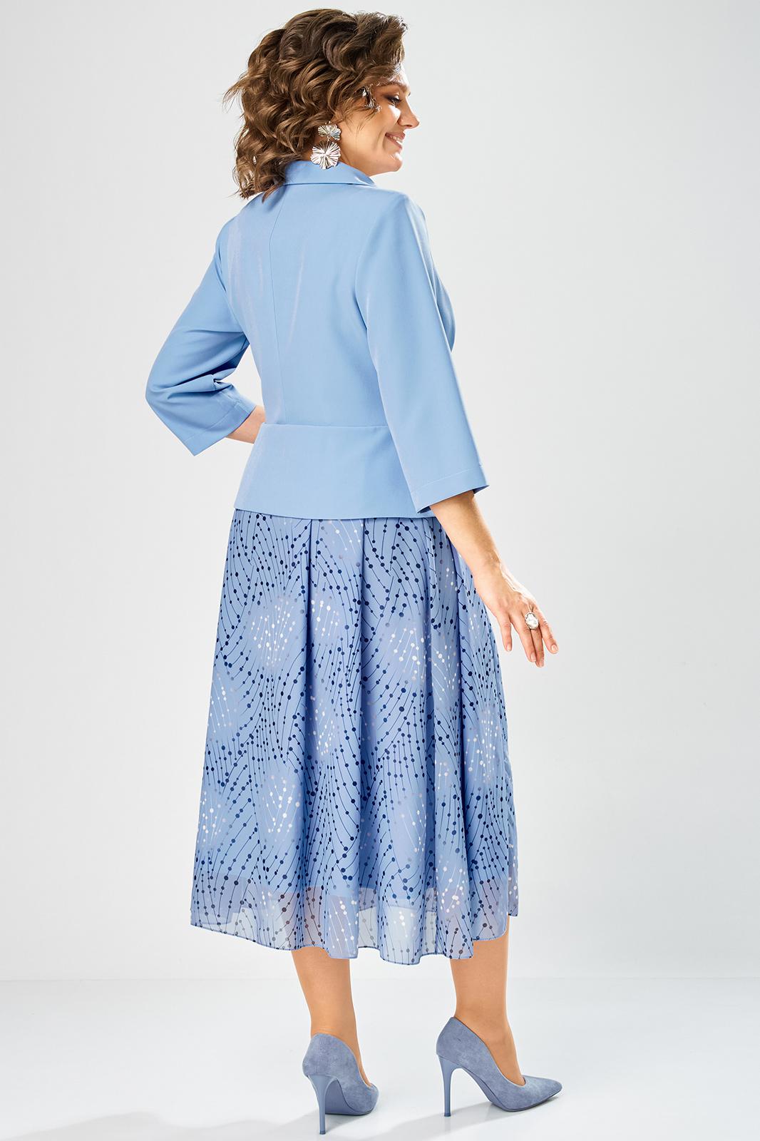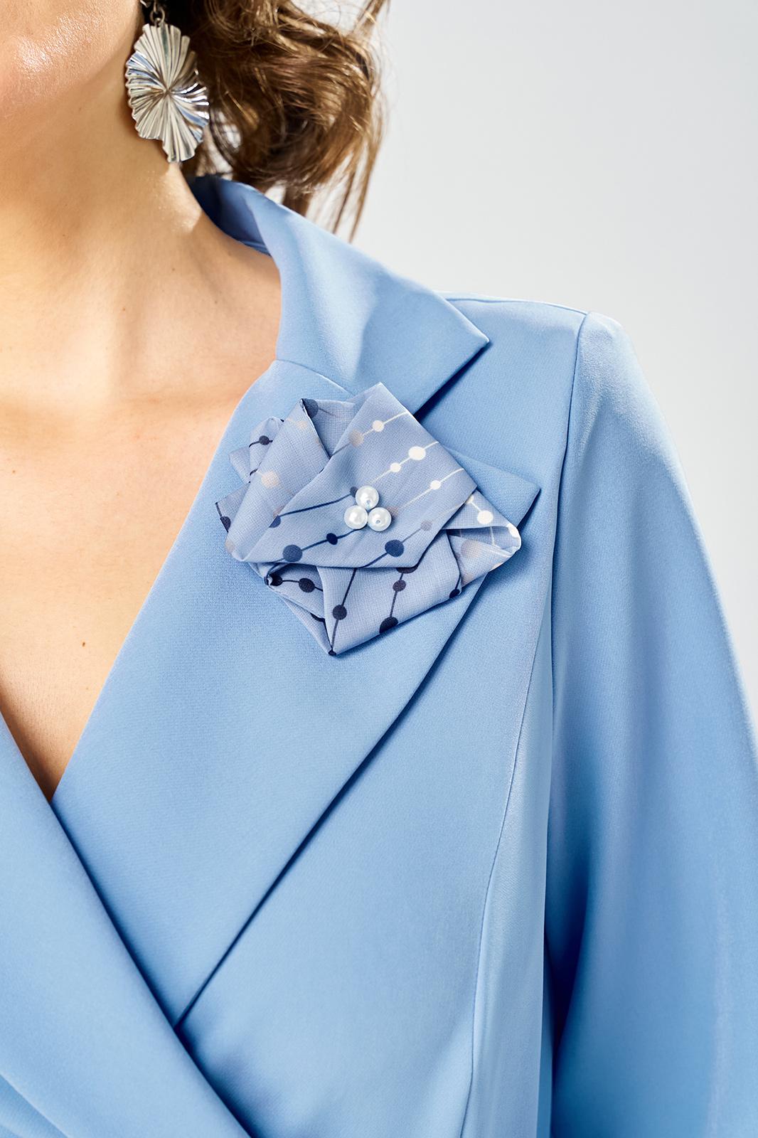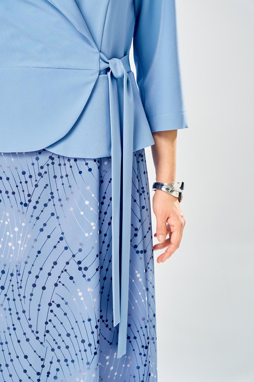 Лиф из плательной ткани, юбка из шифона. Платье с запахом, горловина с воротником пиджачного типа с отложными лацканами. Рукава втачные, длина 3/4.