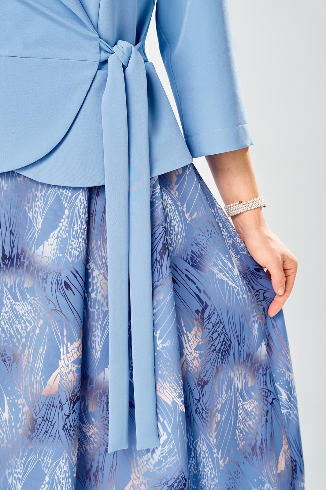 Лиф из плательной ткани, юбка из шифона. Платье с запахом, горловина с воротником пиджачного типа с отложными лацканами. Рукава втачные, длина 3/4.