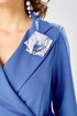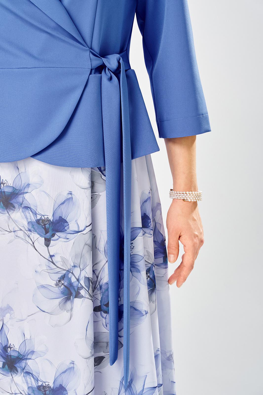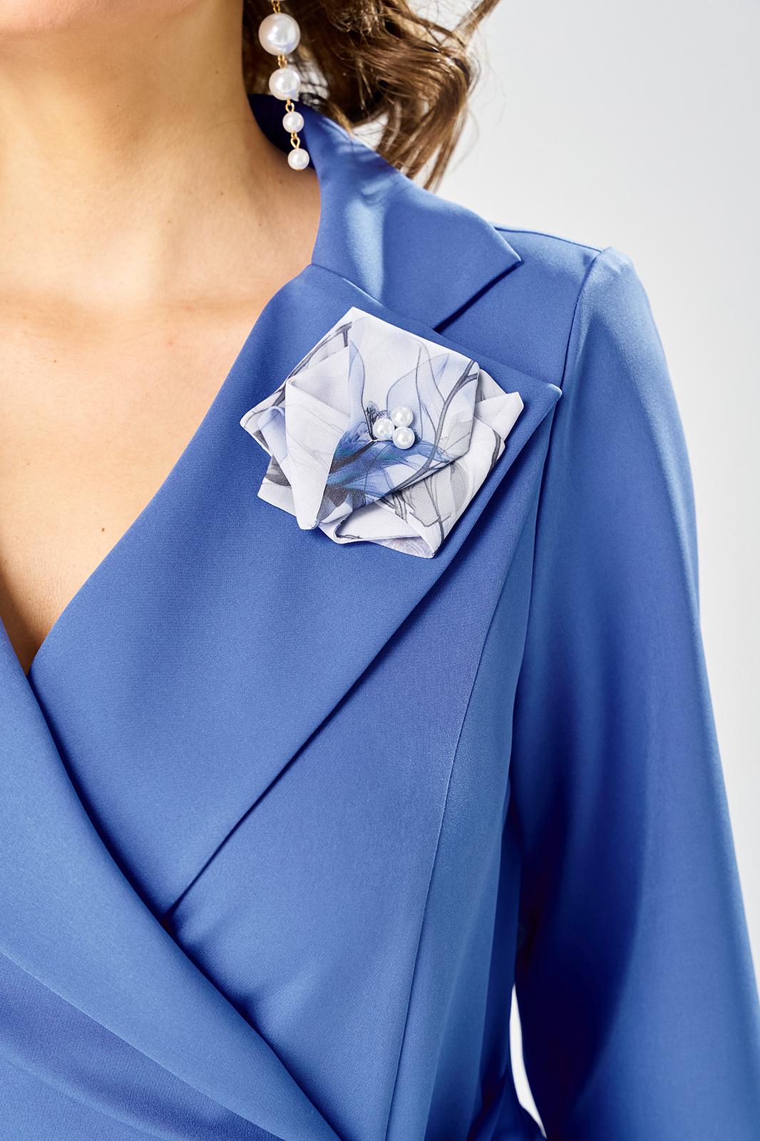 Лиф из плательной ткани, юбка из шифона. Платье с запахом, горловина с воротником пиджачного типа с отложными лацканами. Рукава втачные, длина 3/4.